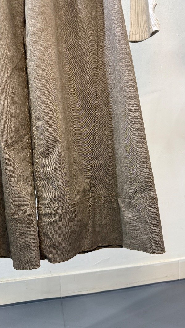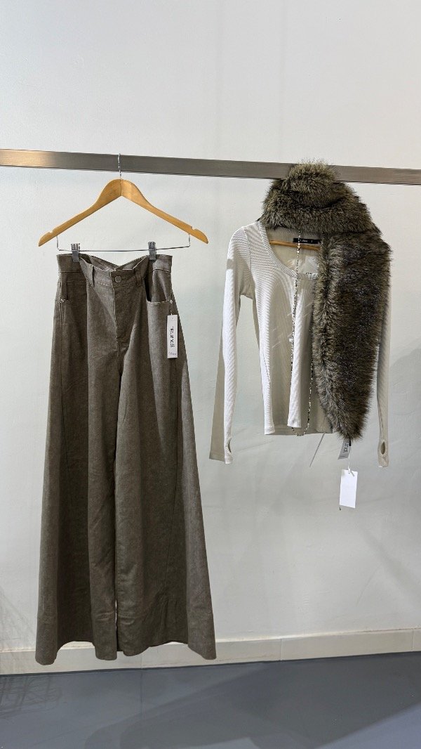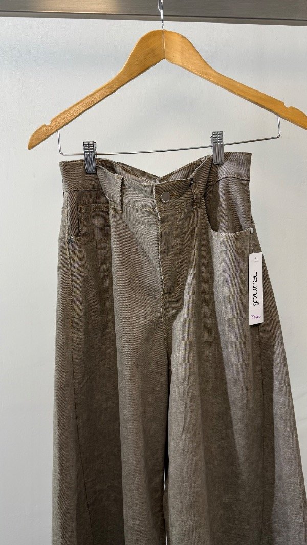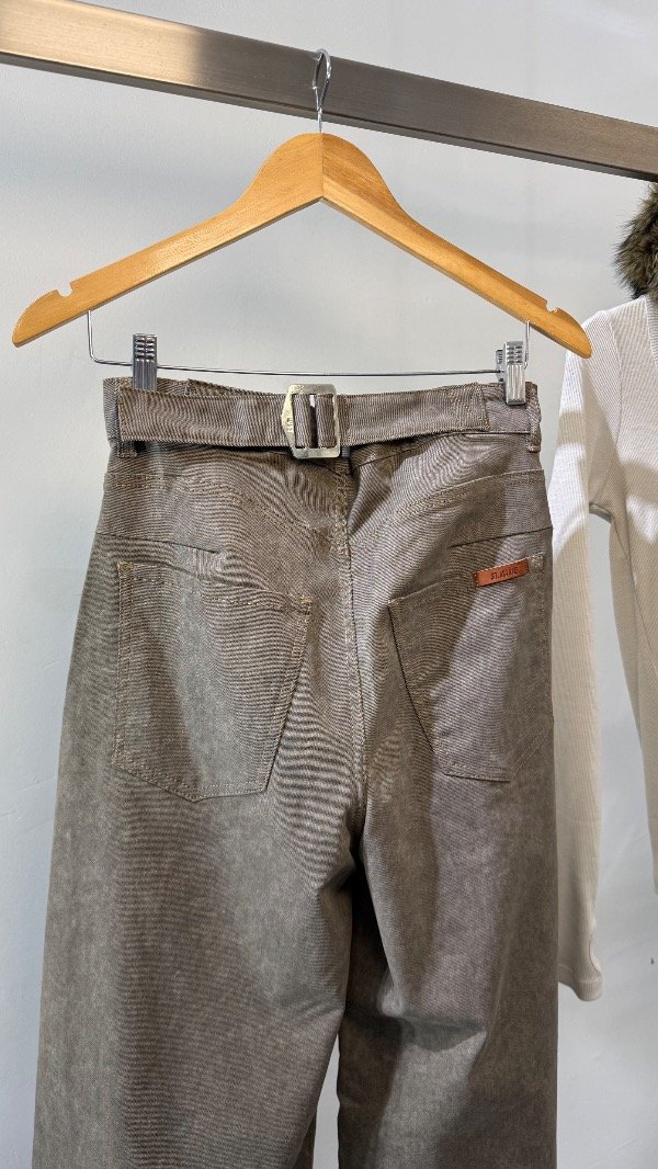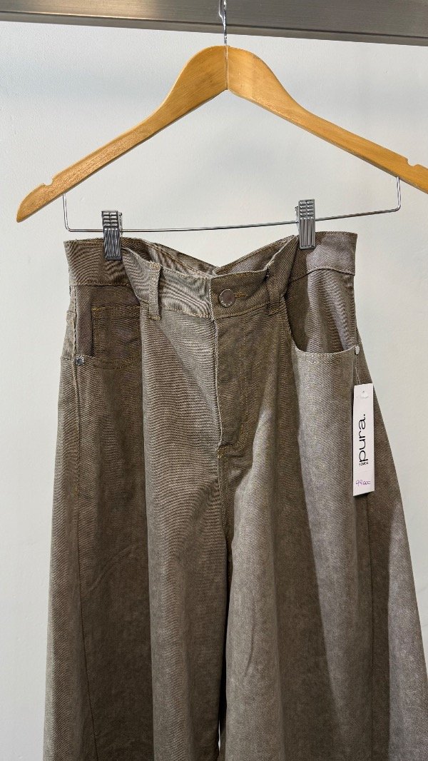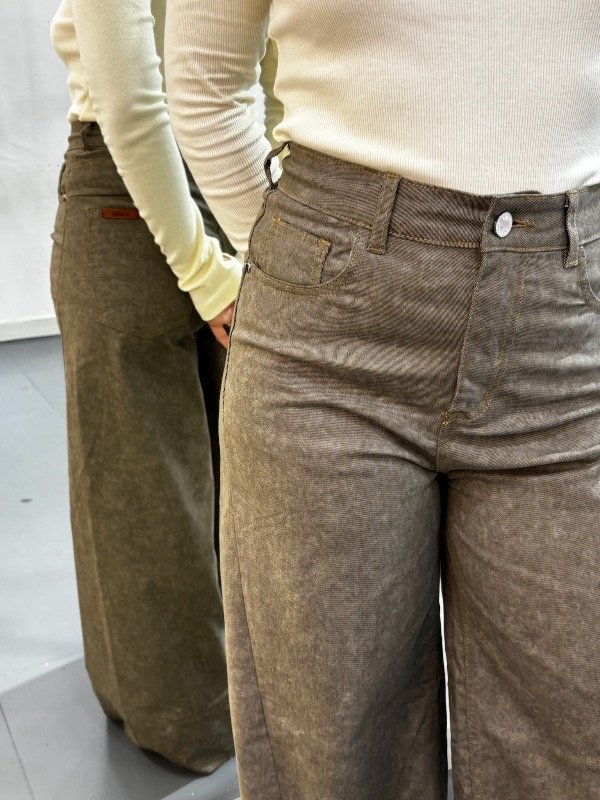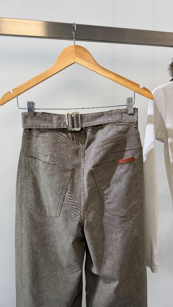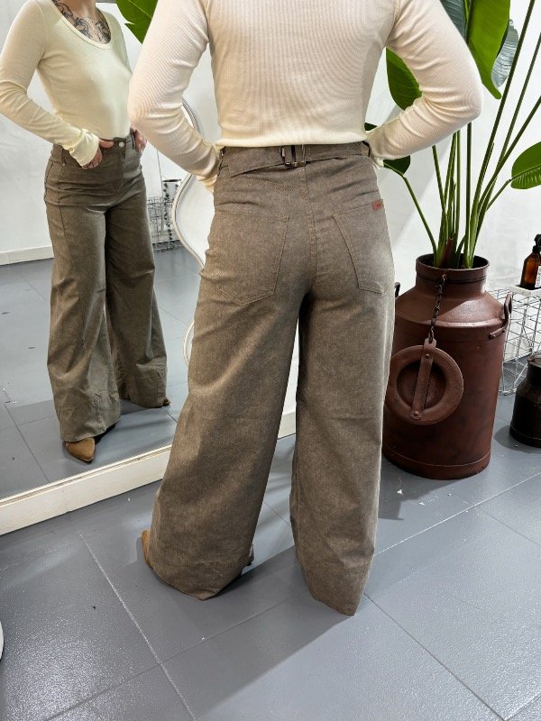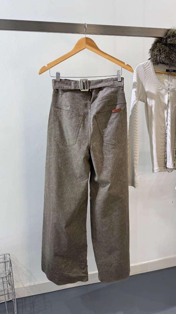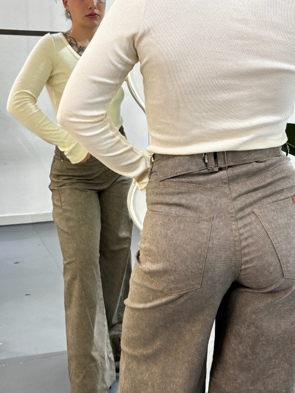 Pantalón de gabrdina tiro medio de cinco bolsillos. Calce relajado con pierna amplia y recortes. Detalle de hebilla eprsonalizada en cintura.