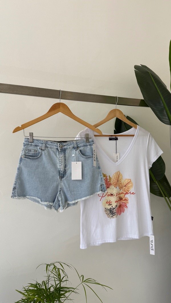 Short elastizado de cinco bolsillos con ruedo desflecado, en el bolsillo trasero lleva una chapita con identificación de marca
