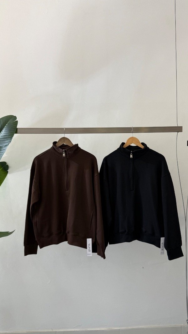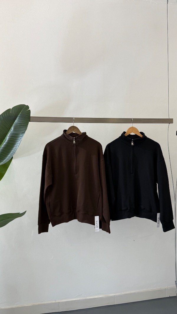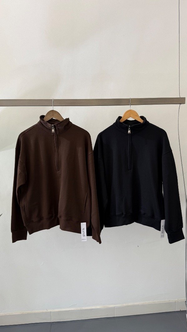 Buzo de rústico cuello alto, calce oversize, con puño en manga y ruedo.