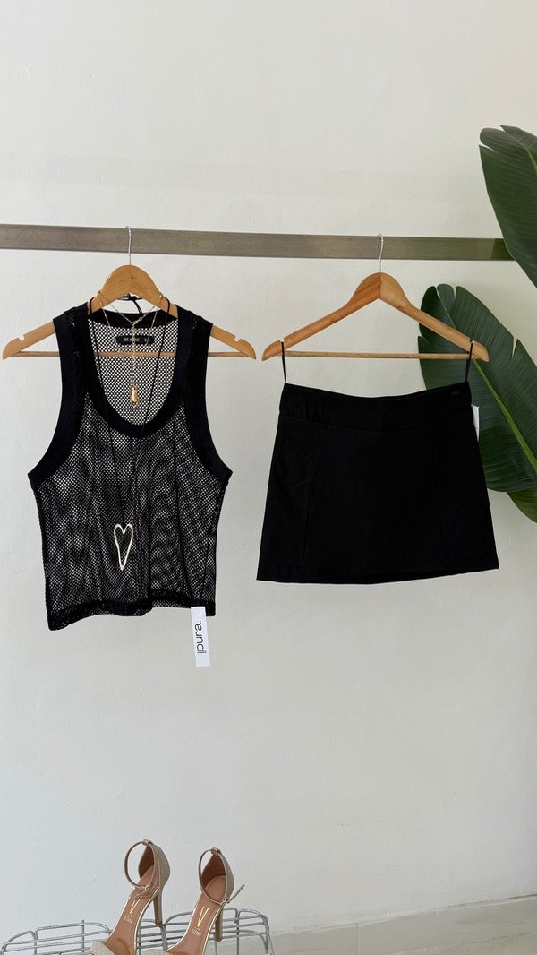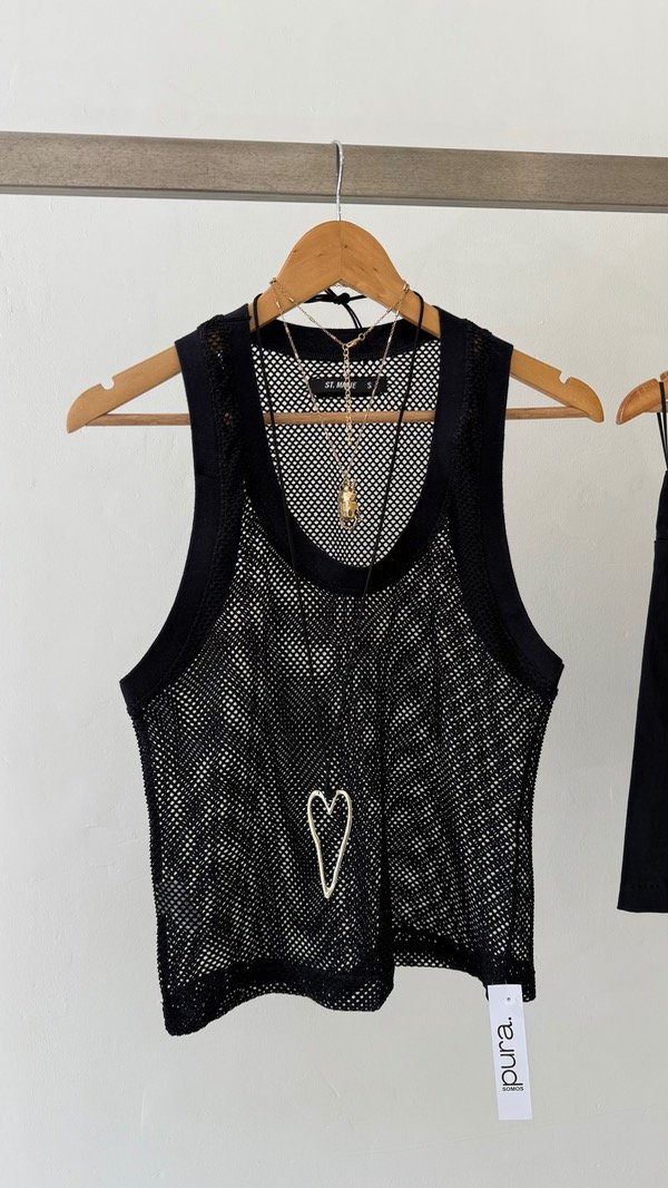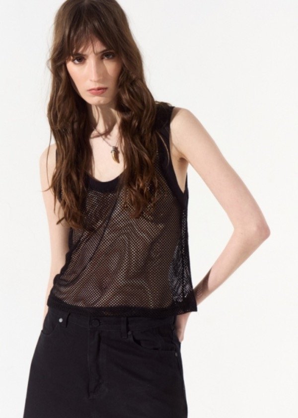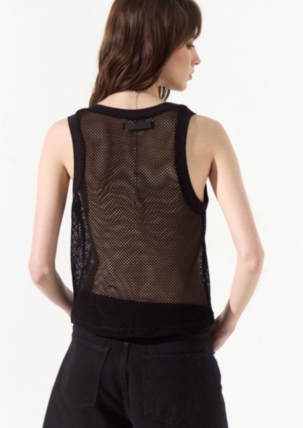 Musculosa de red con terminaciones en ribb, a modo de detalle en su espalda se le colocó una badana de cuero con la identificación de marca.