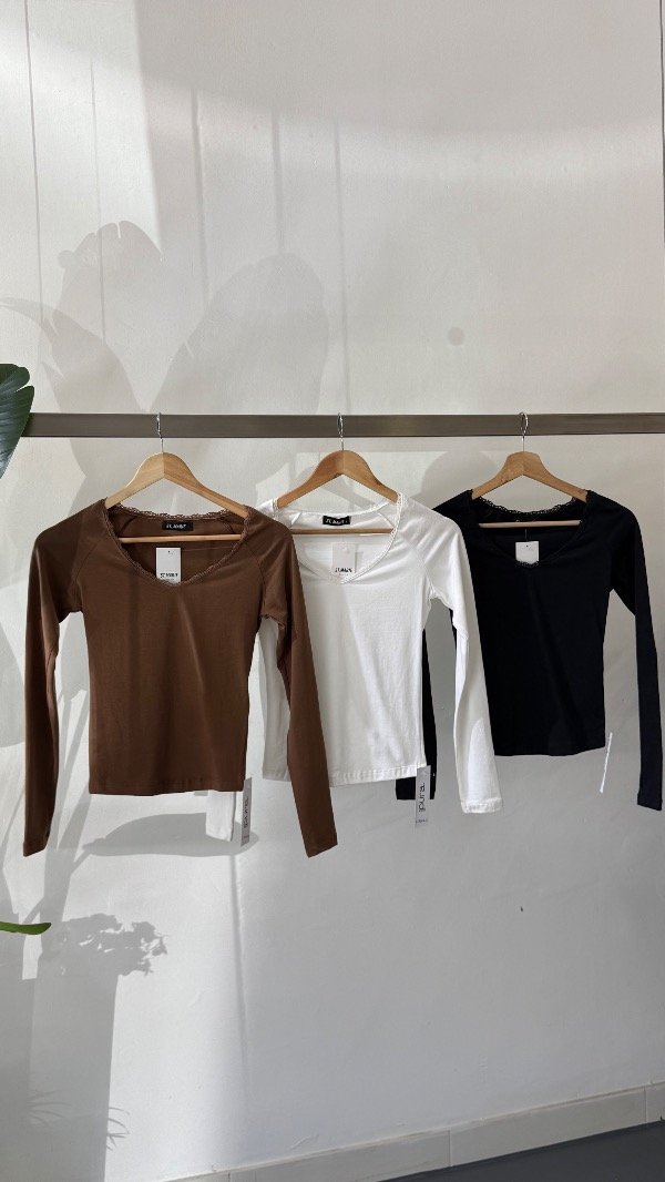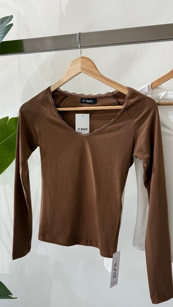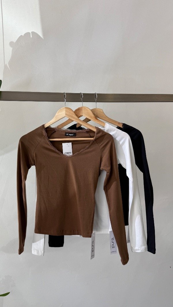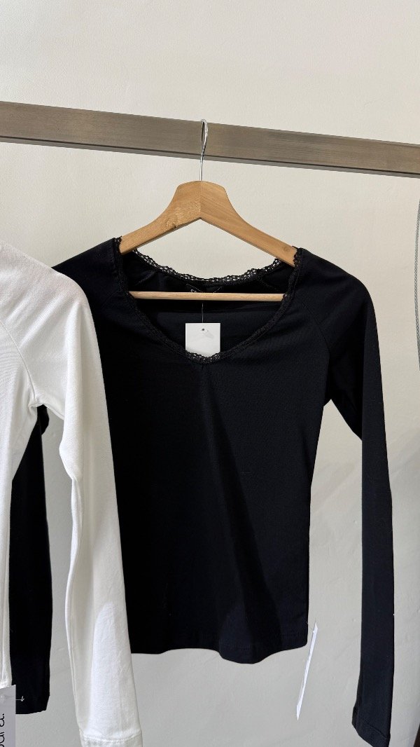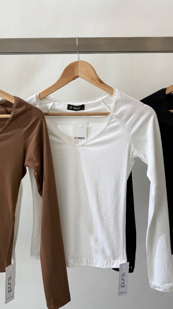 Remera manga larga, escote U con puntilla, confeccionada en algodón con lycra. En la espalda superior lleva dije con identificación de marca.