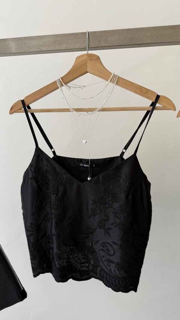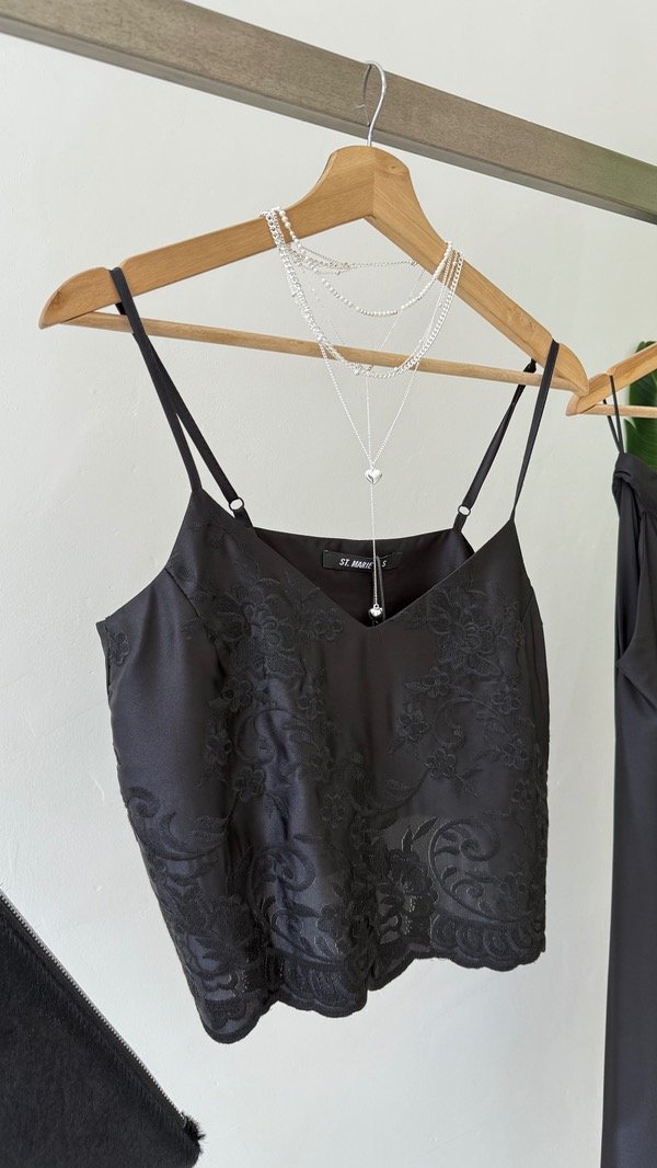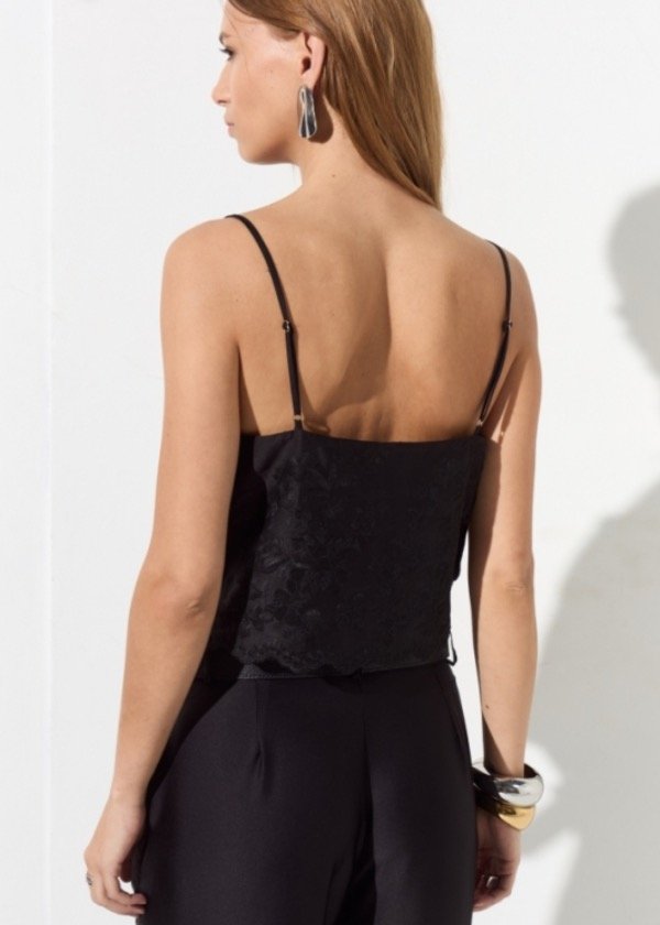 Top confeccionado en seda con guarda bordada en zona del ruedo.