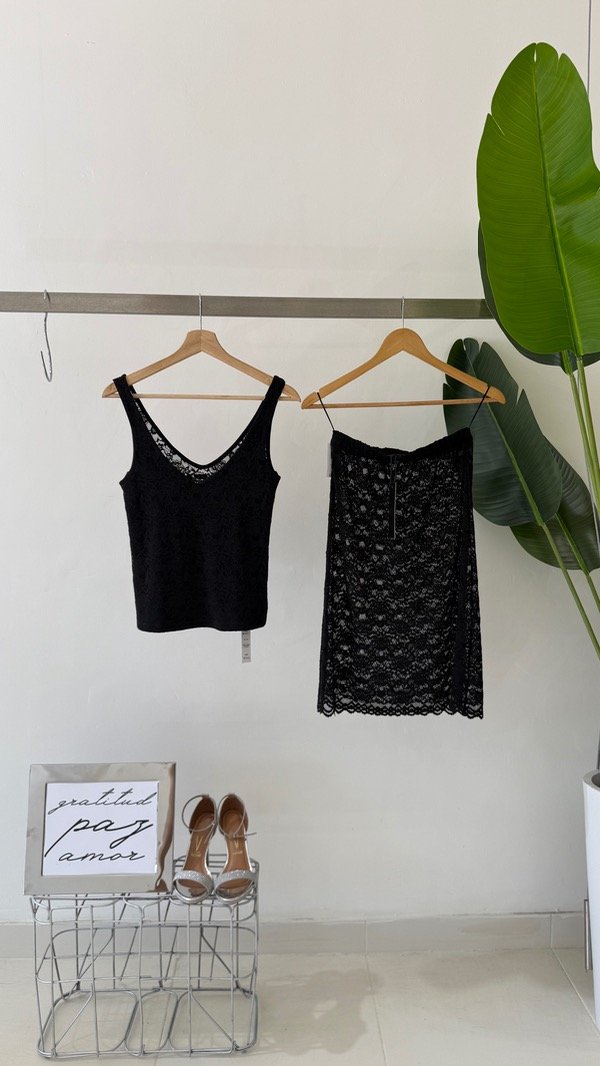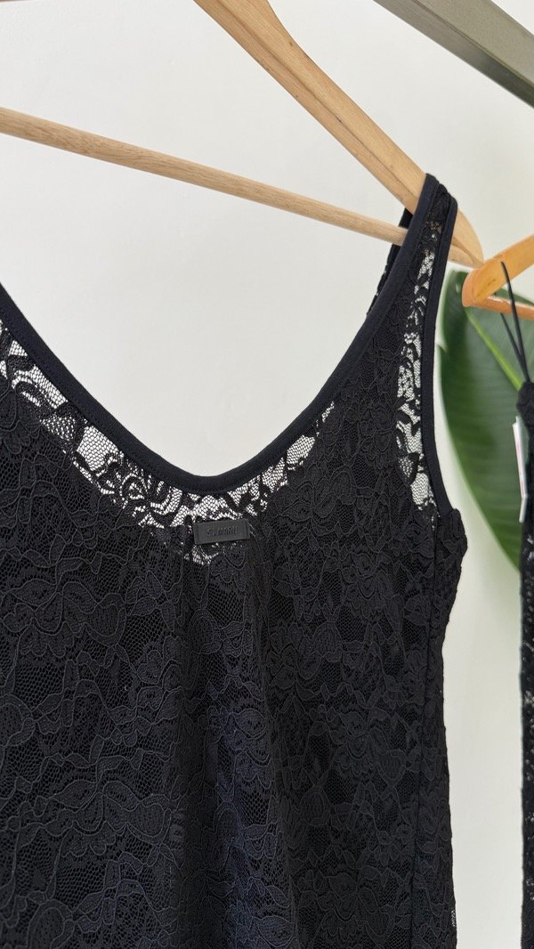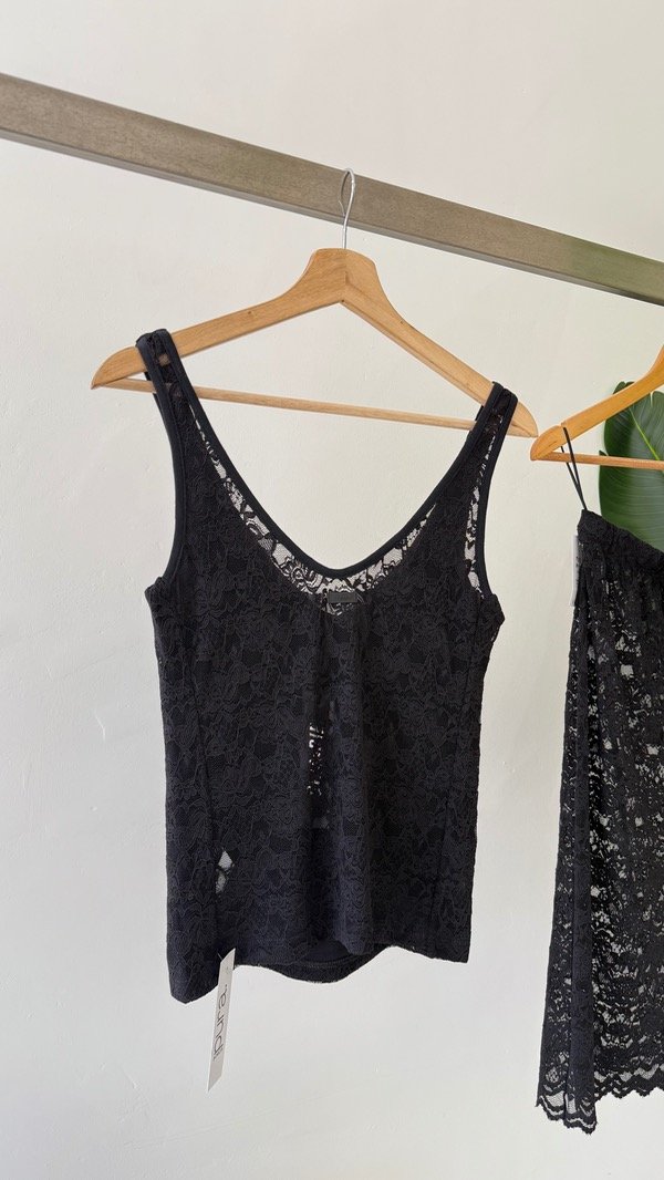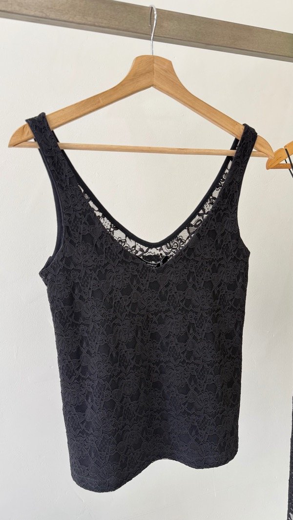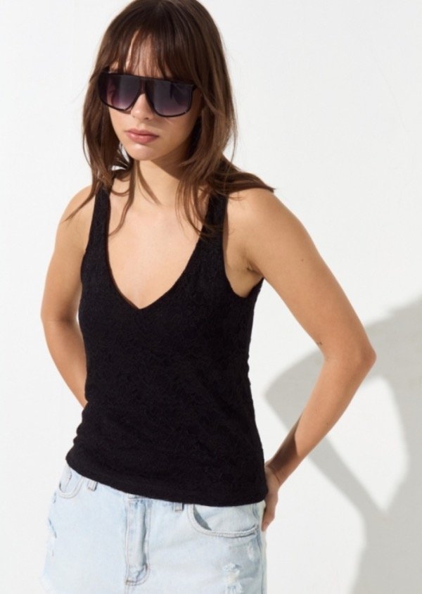 Top de encaje con escote v, su delantero está forrado para que no se transparente la prenda, la sisa y el escote están terminados con collareta para dar mejor terminación y calce a la prenda.