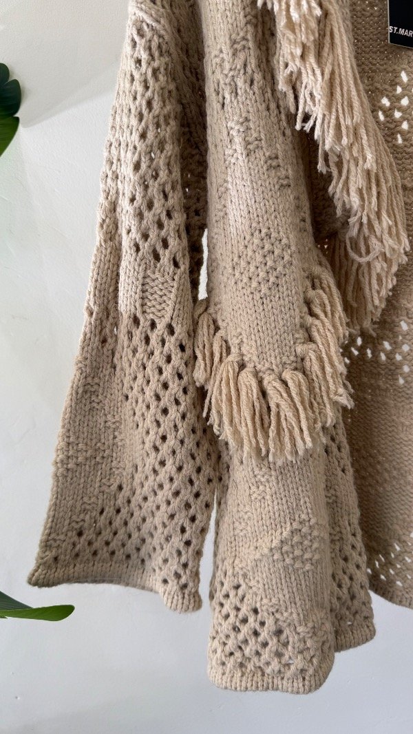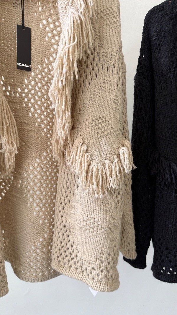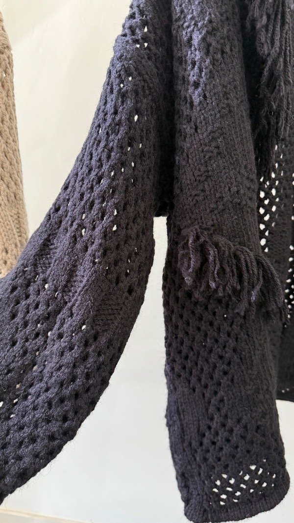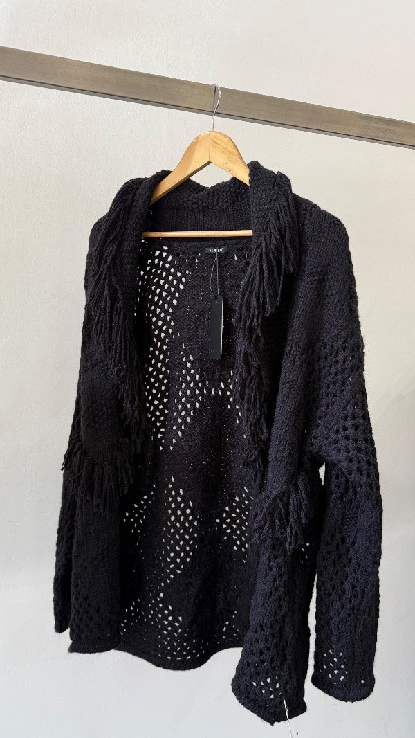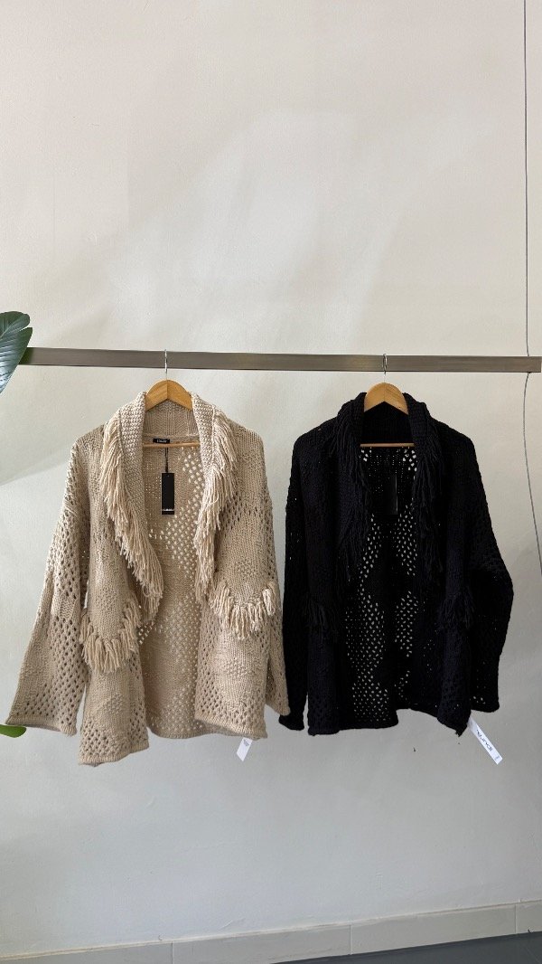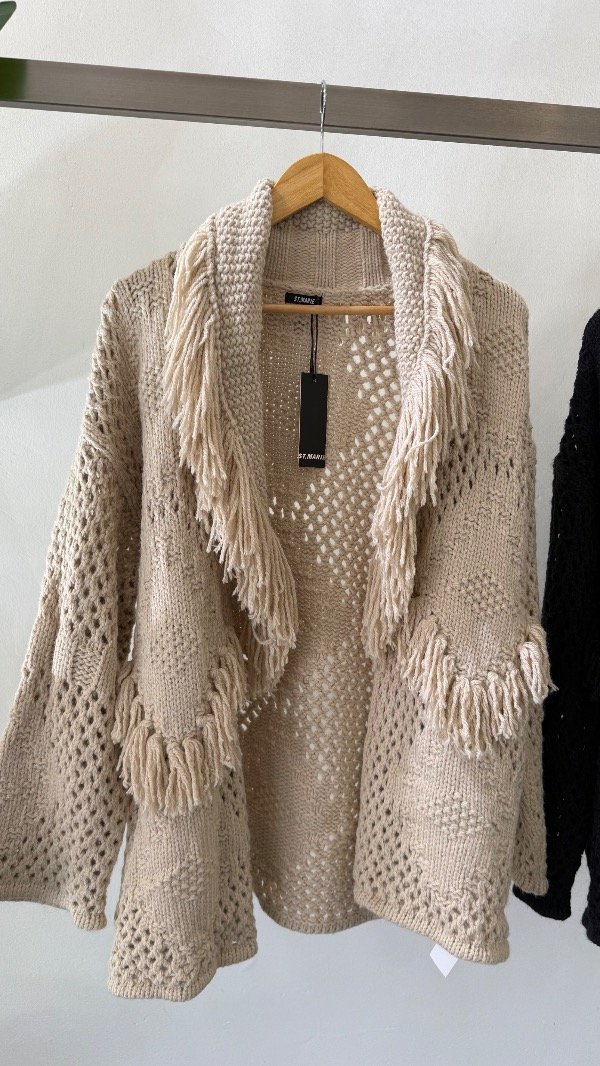Cárdigan tejido de calce relajado, con cuello volcado y detalles de flecos en su recorrido.