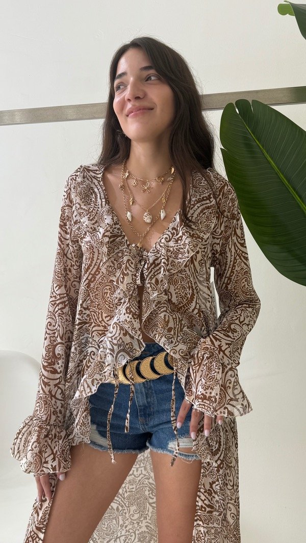Kimono de gasa estampado con destellos dorados. Talle único, abarca un S al L