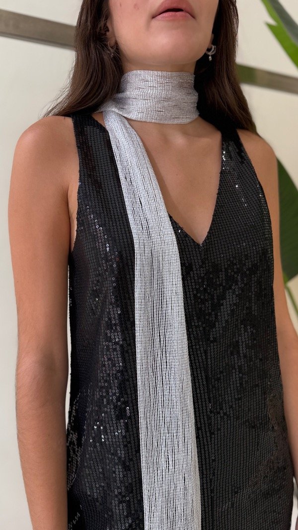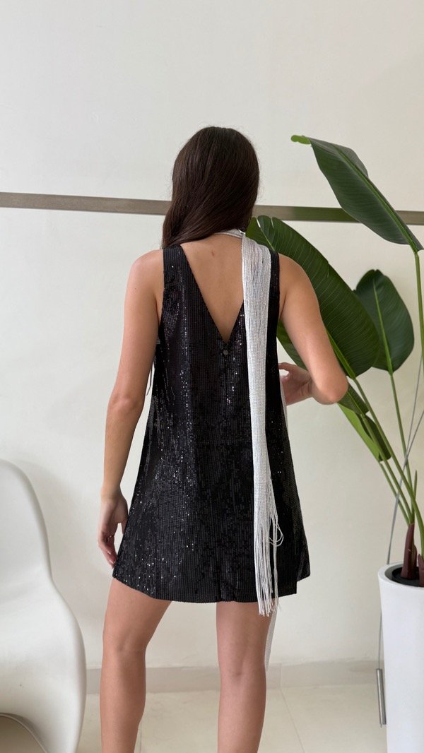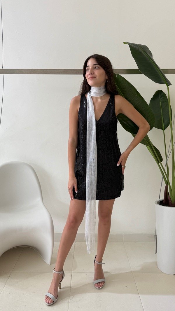 Vestido corto de lentejuelas. Tiene escote V y anchos breteles.