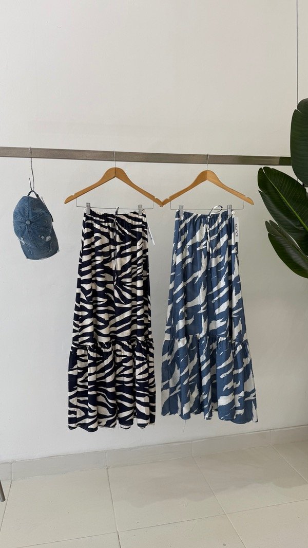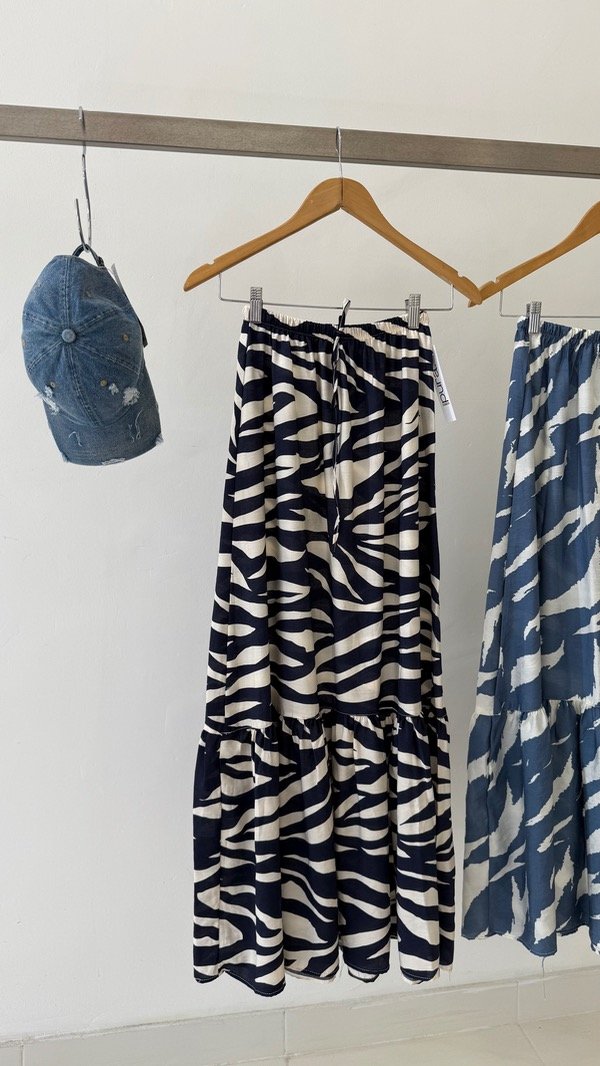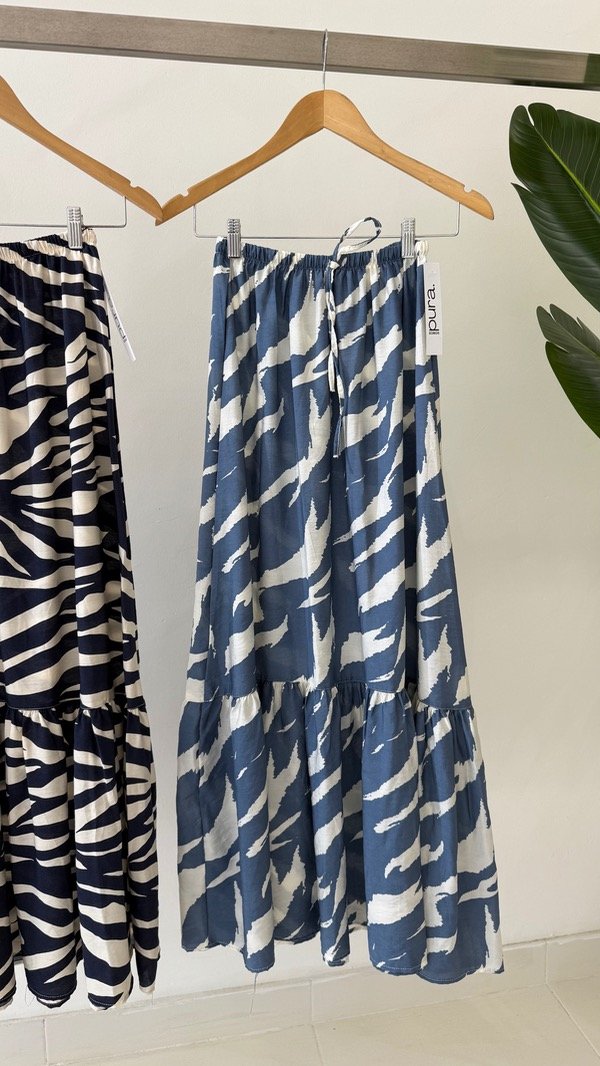 Falda de voile rayón estampado con cintura elastizada regulable y volado inferior. Talle único, abarca de un S al L