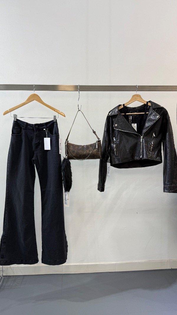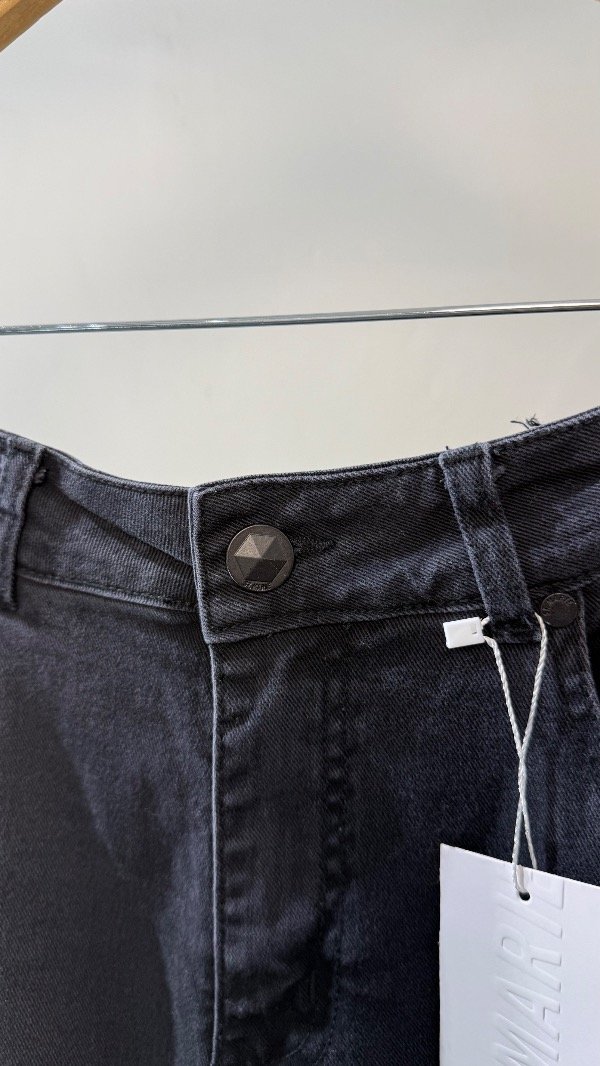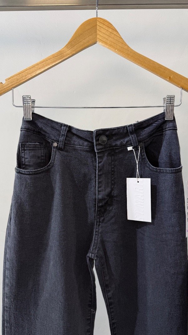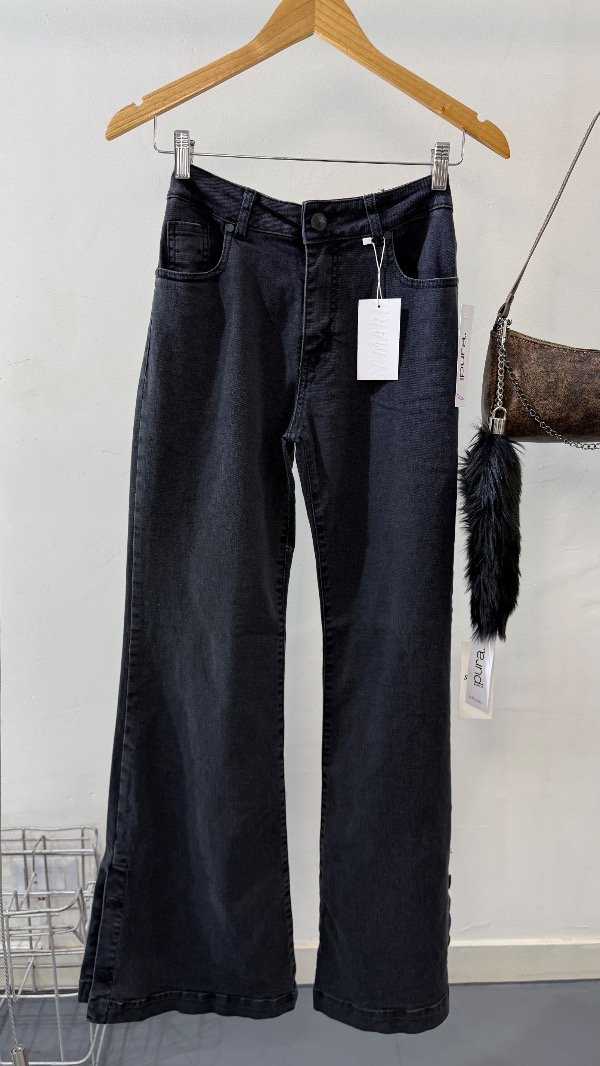 Jean cinco bolsillos tiro medio , con pierna ajustada que se va abriendo hacia la botamanga. Detalle de broches en tajos