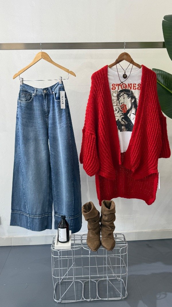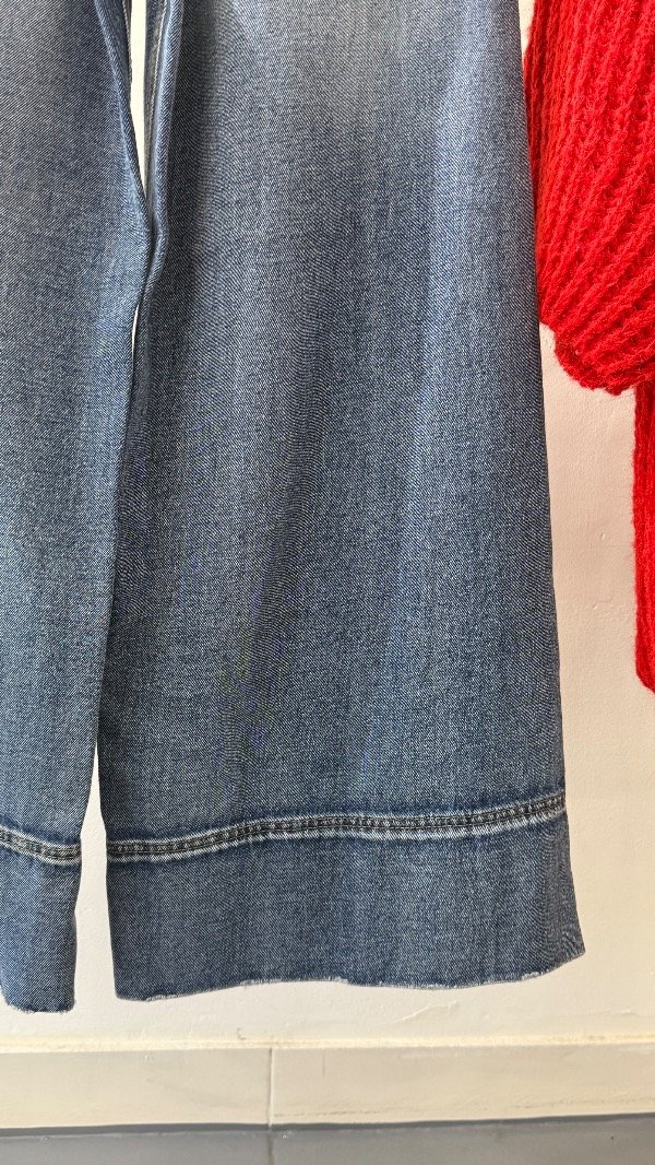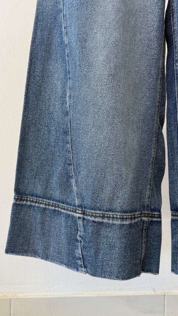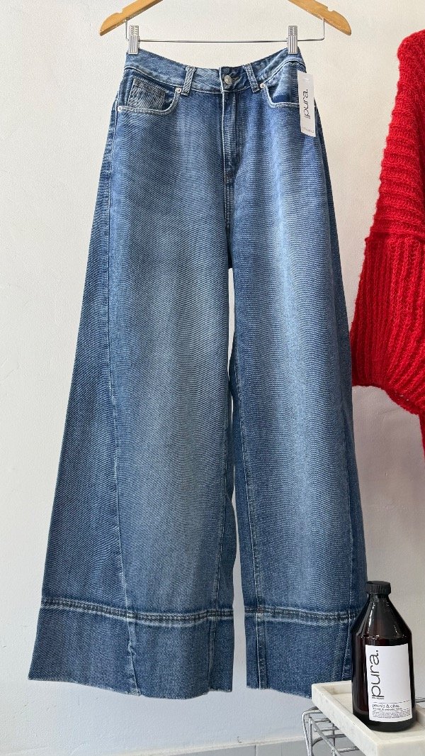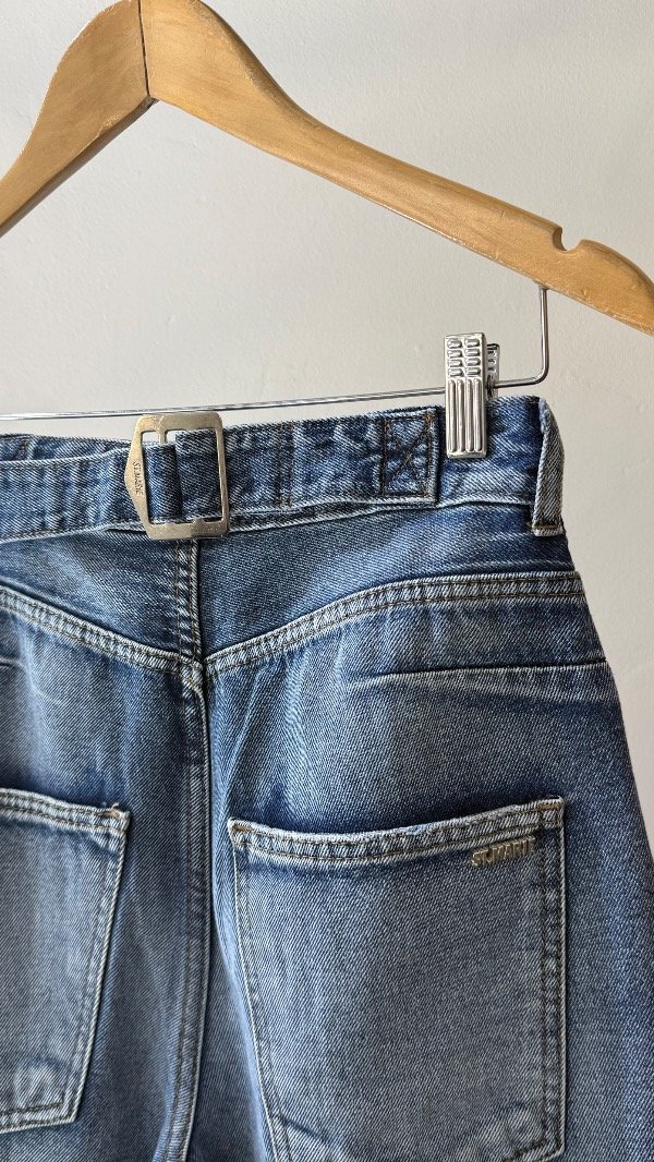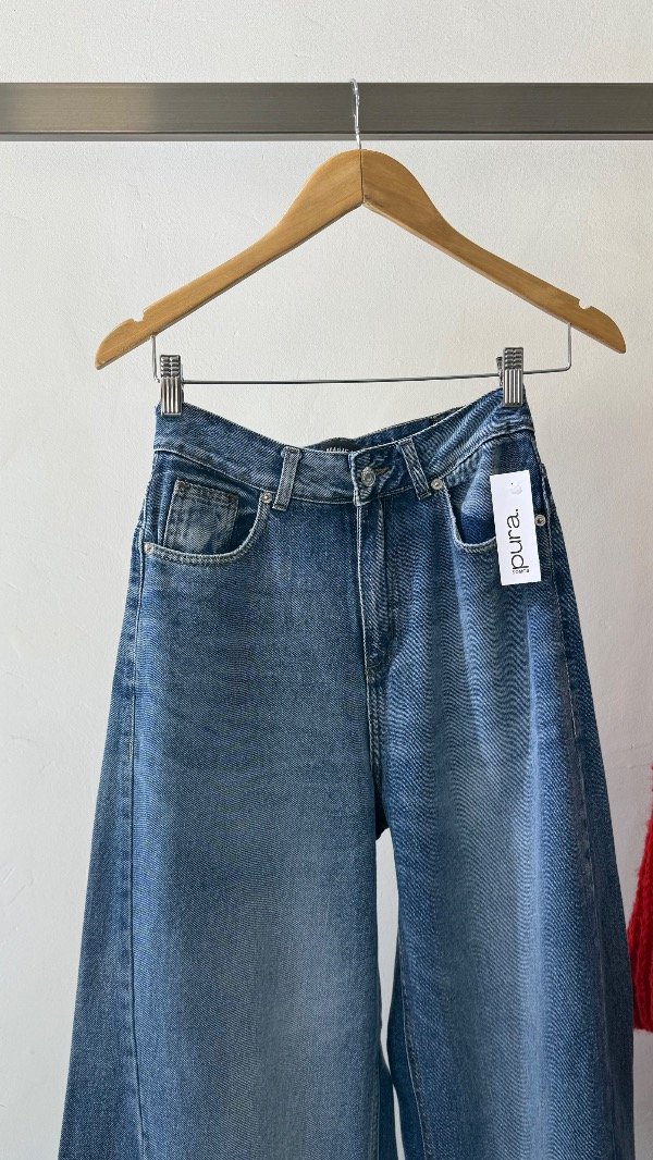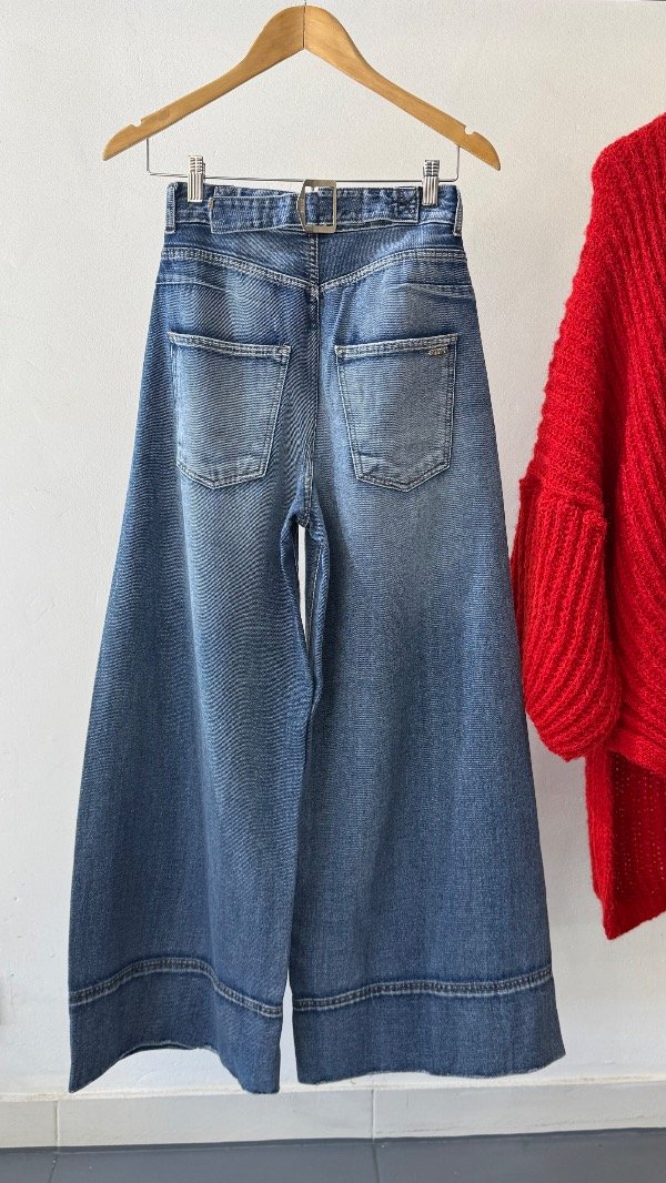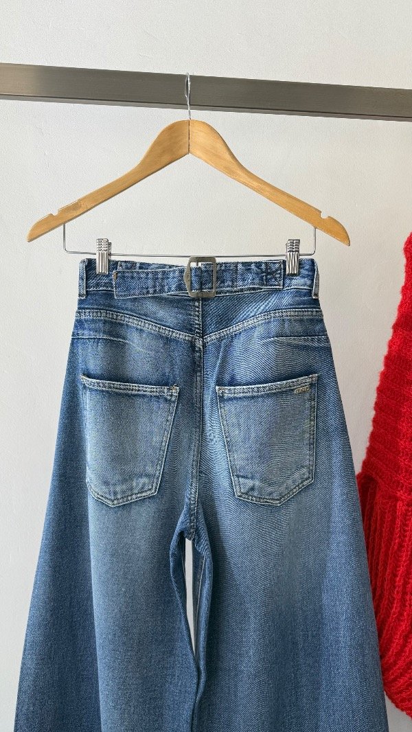 Jean tiro alto de cinco bolsillos. Calce relajado, con pierna ancha y recortes. Lavado azul localizado. Detalle de hebilla personalizada en cintura.