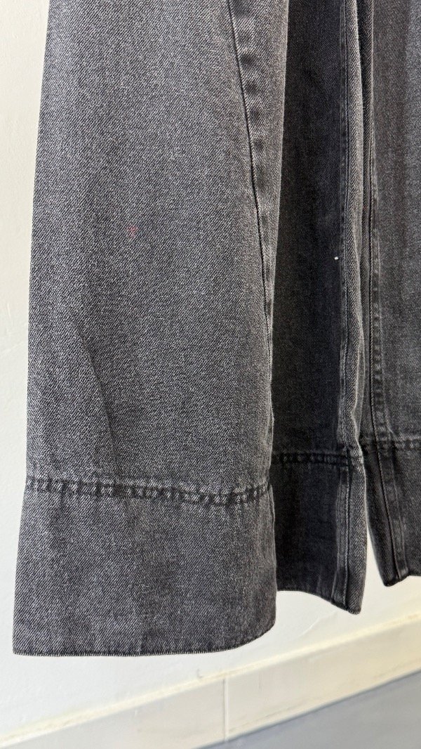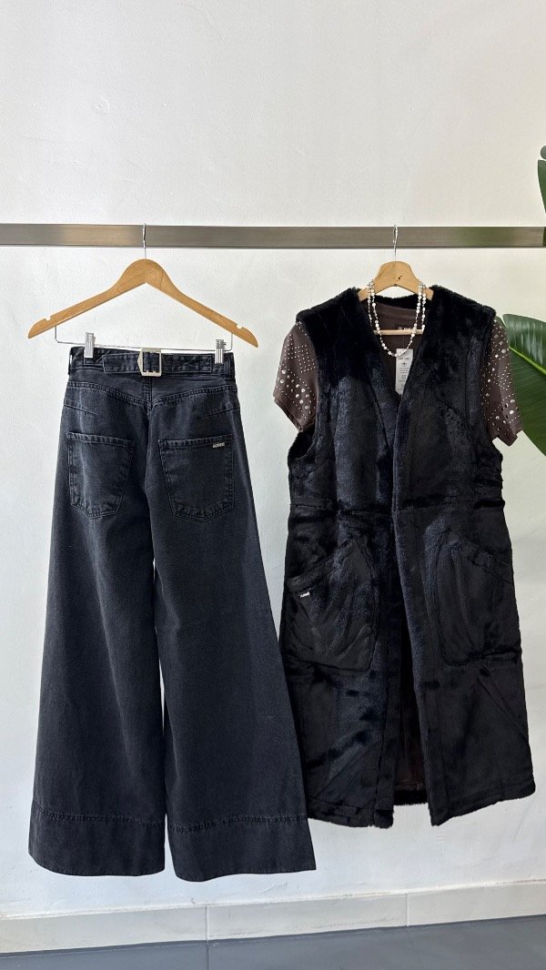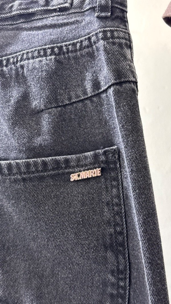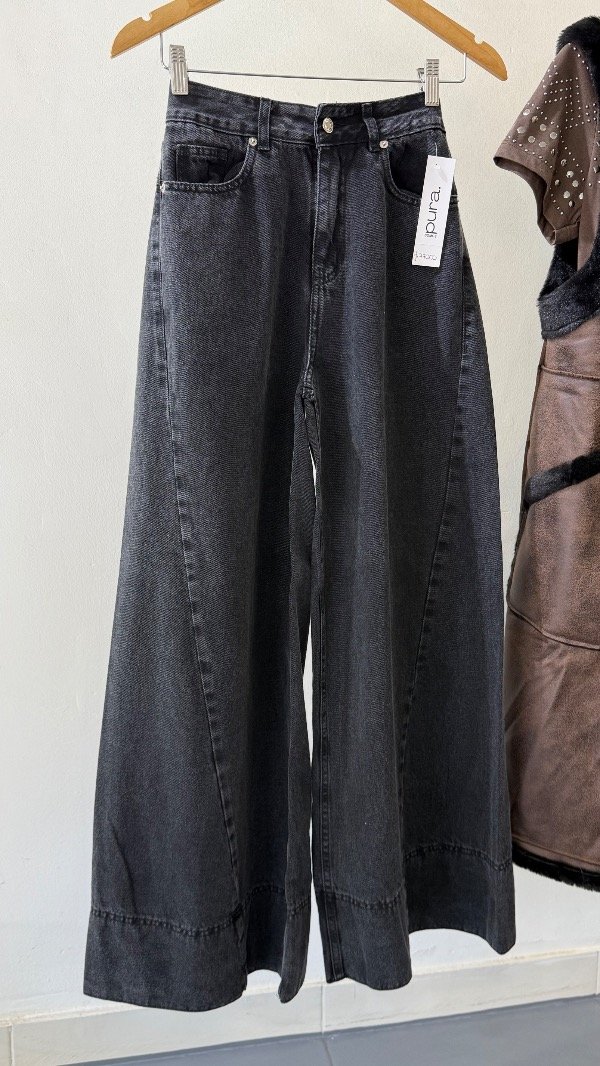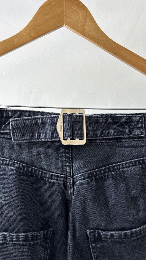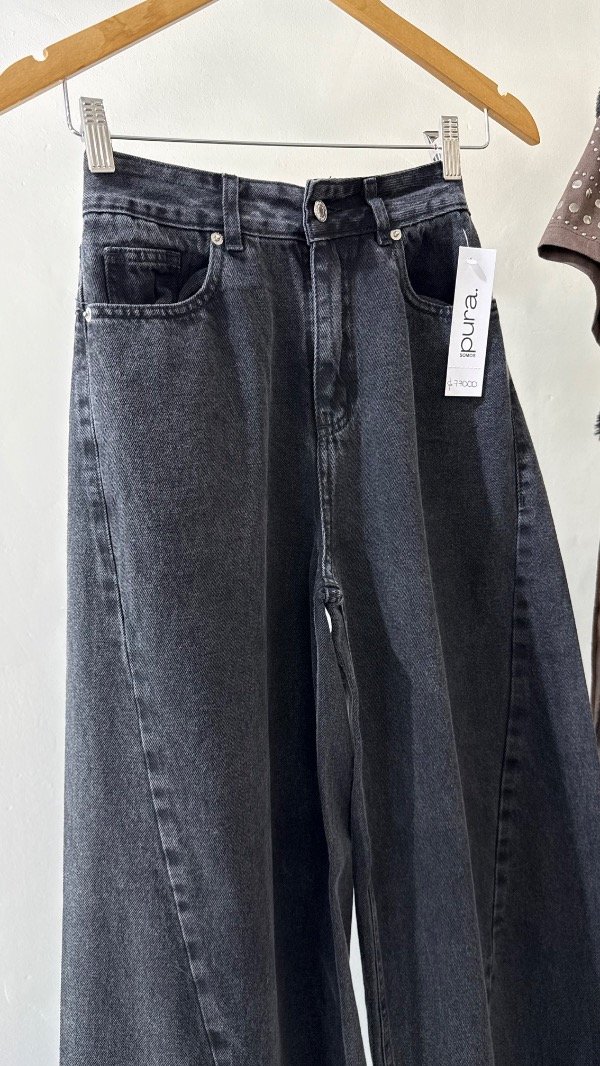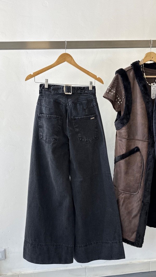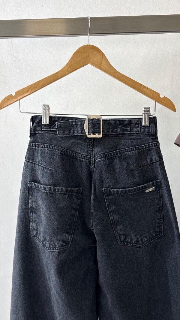 Jean tiro alto de cinco bolsillos. Calce relajado, con pierna ancha y recortes. Detalle de hebilla personalizada en cintura.
