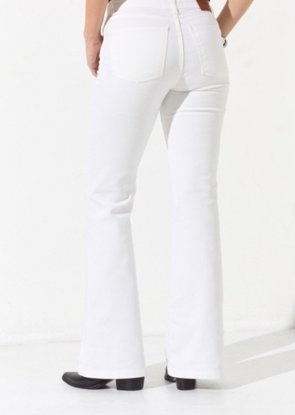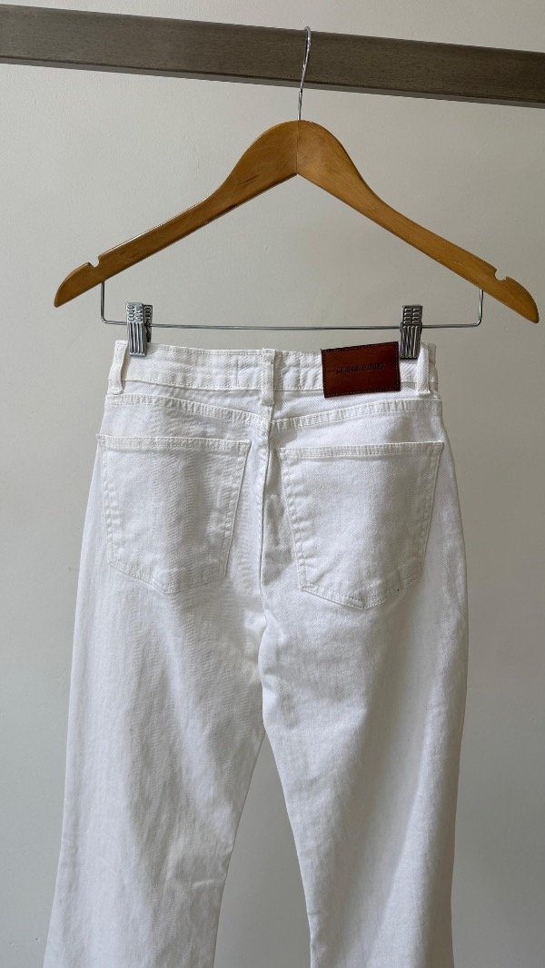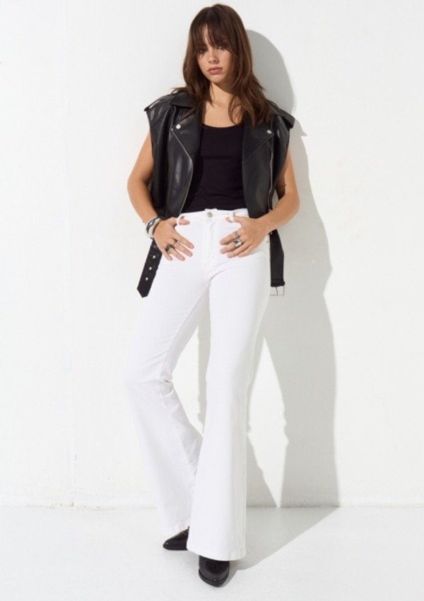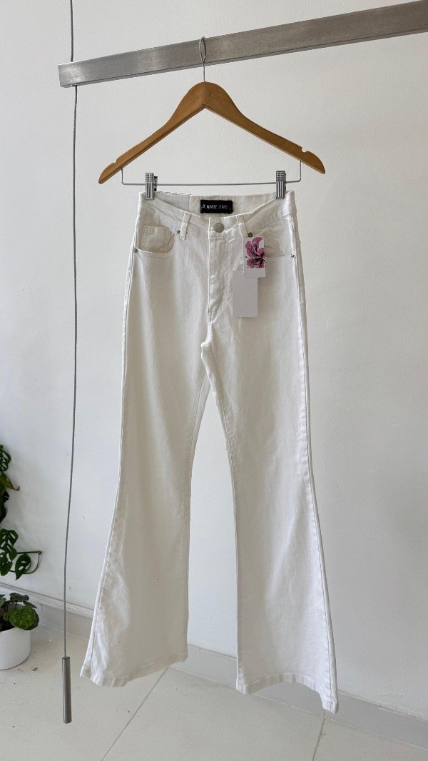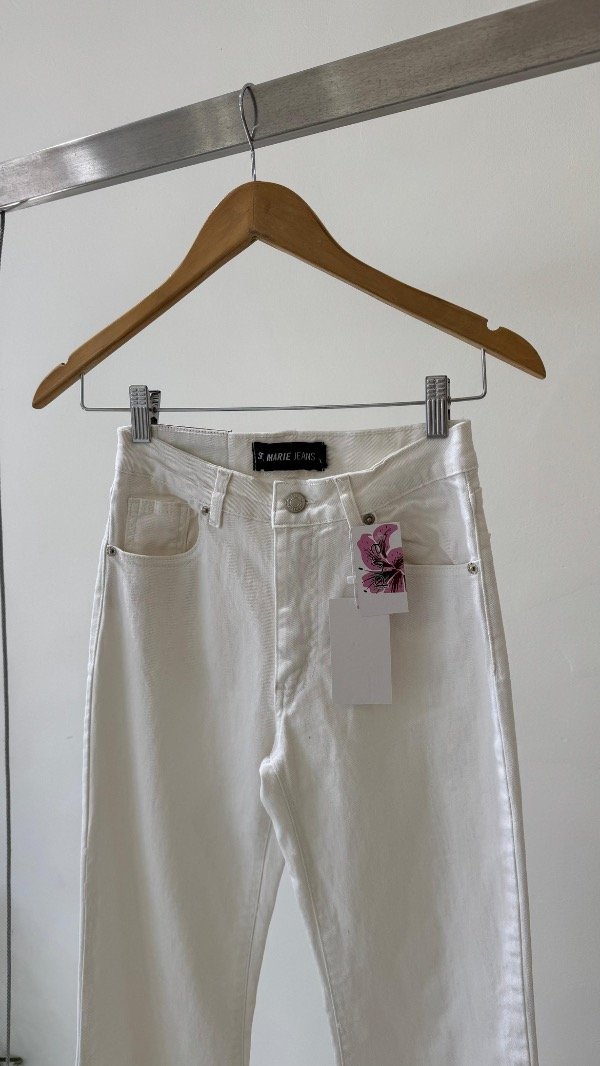 Jean de tiro medio, posee cinco bolsillos su calce es oxford y lleva un ruedo ancho, su tela es elastizada, y a modo de detalle lleva una chapita con la identificación de marca.