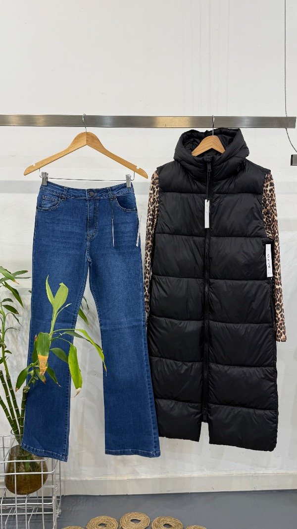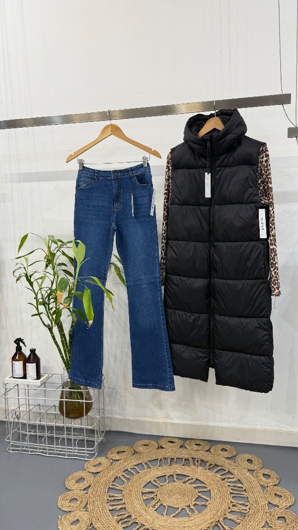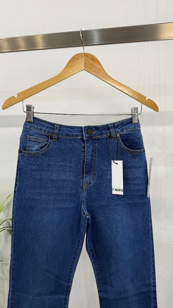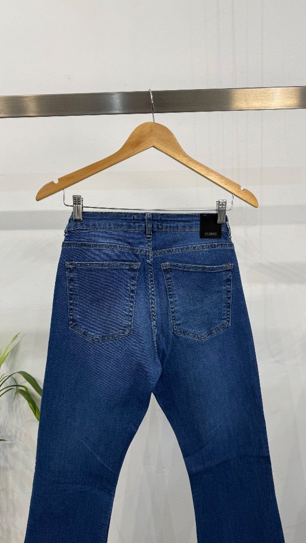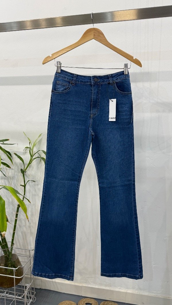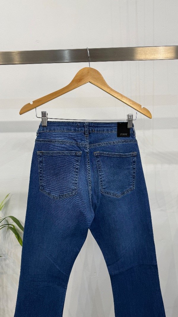 Jean cinco bolsillos tiro medio, con pierna ajustada que se ensancha levemente desde la rodilla. Lavado azul.