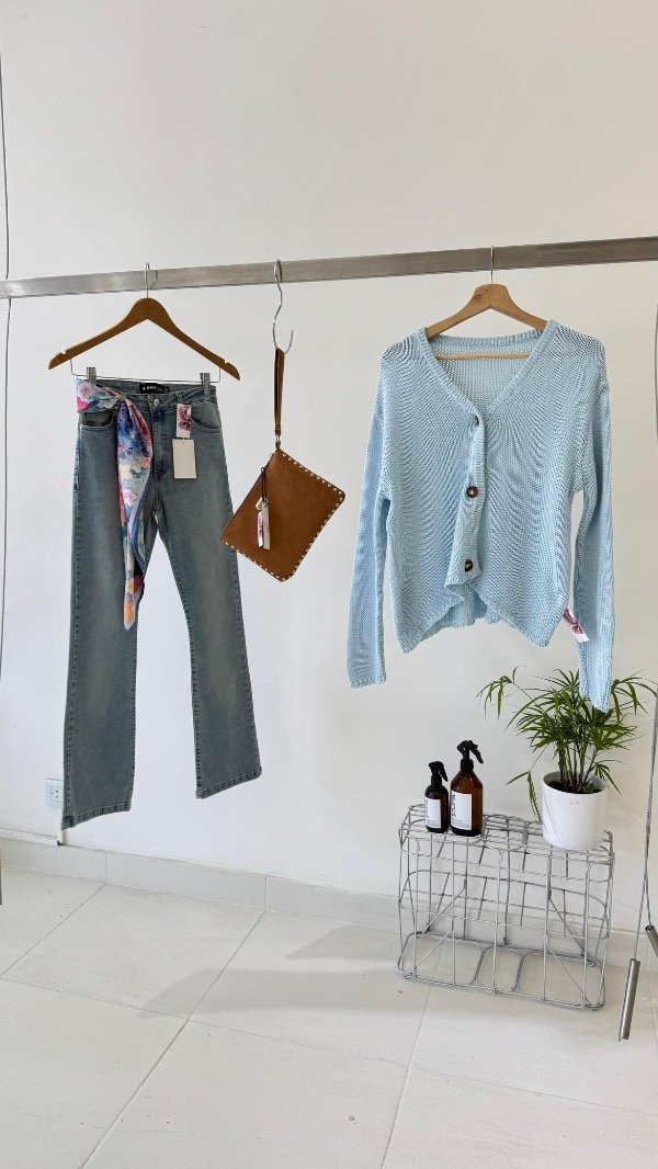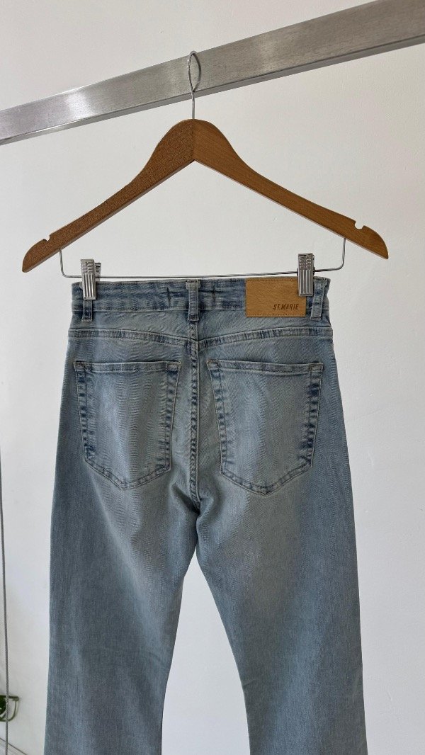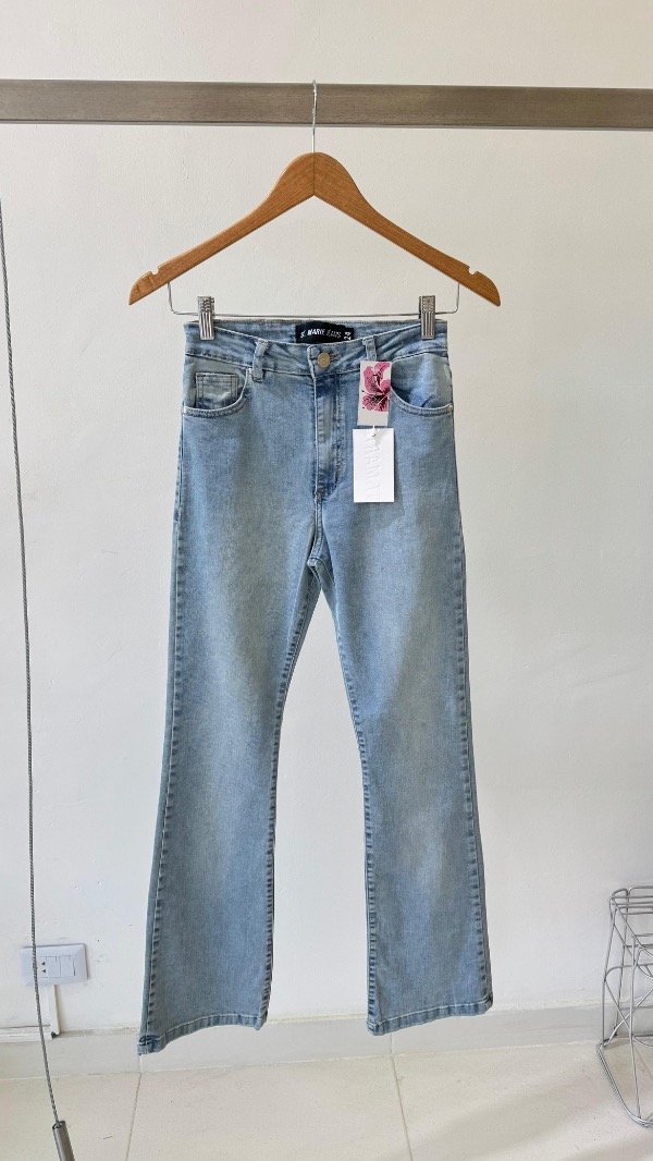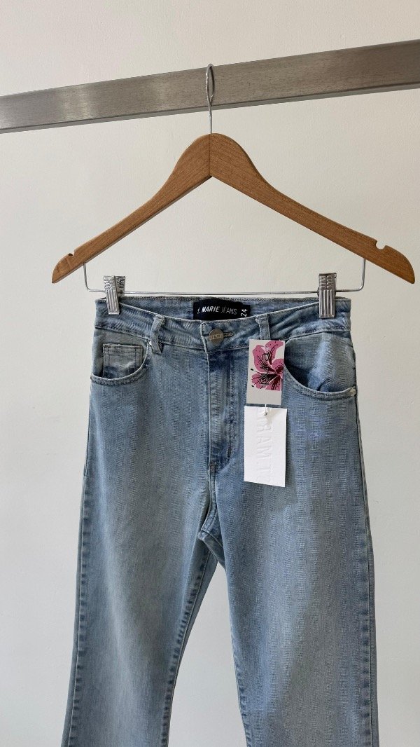 Jean de calce recto, posee cinco bolsillos, de tiro medio alto, su tela es elastizada y su largo llega hasta el tobillo. A modo de detalle en la cintura trasera lleva una badana con la identificación de marca.