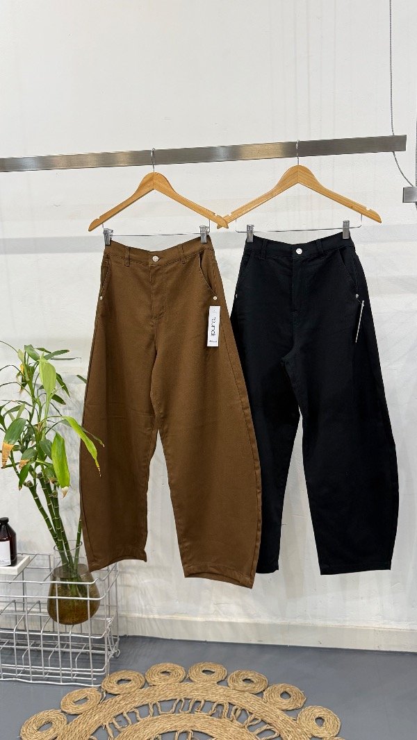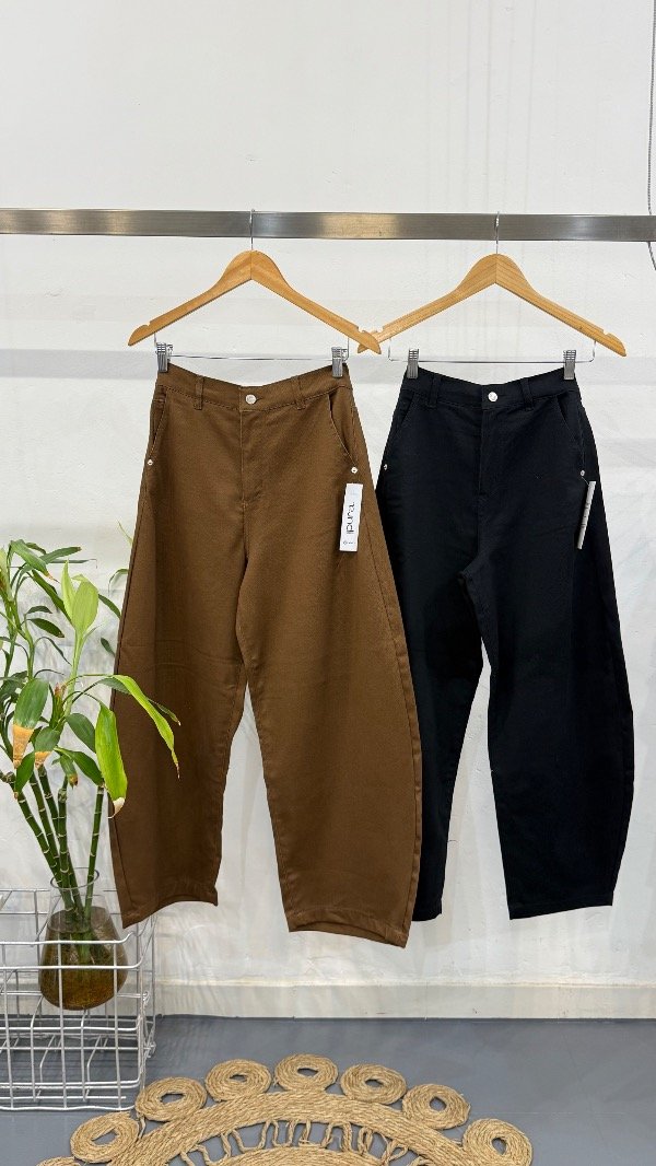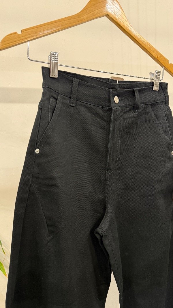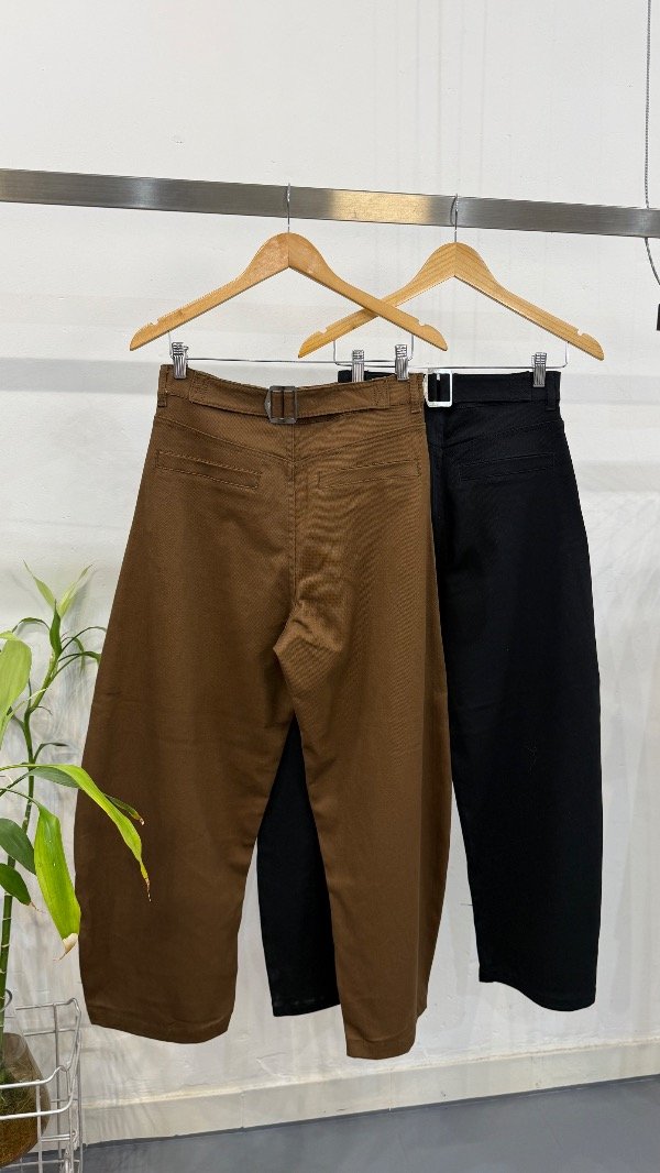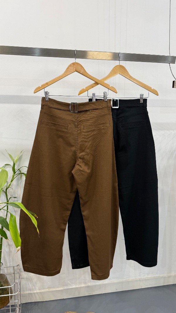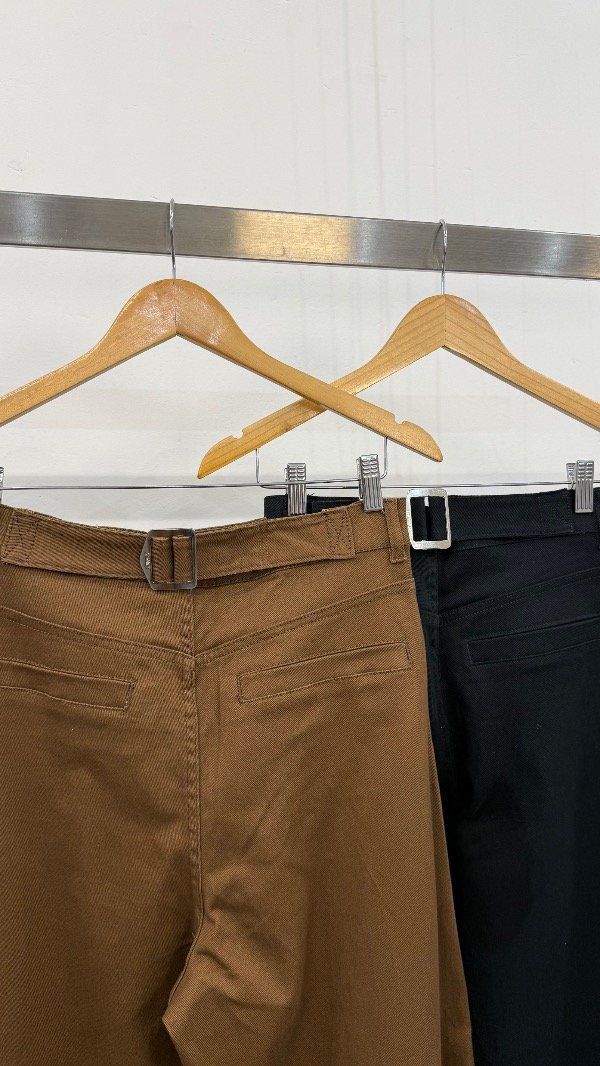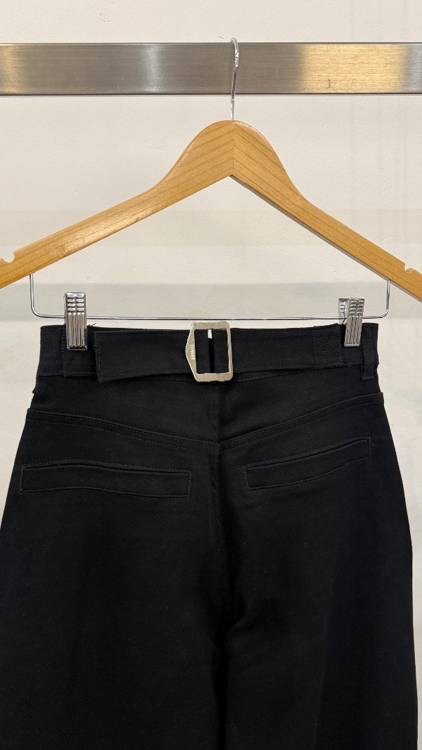 Pantalón tiro alto de gabardina. Calce con pierna curva y detalle de hebilla en espalda.