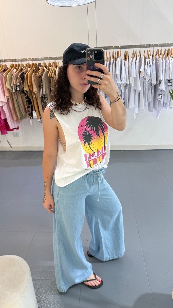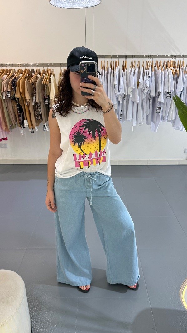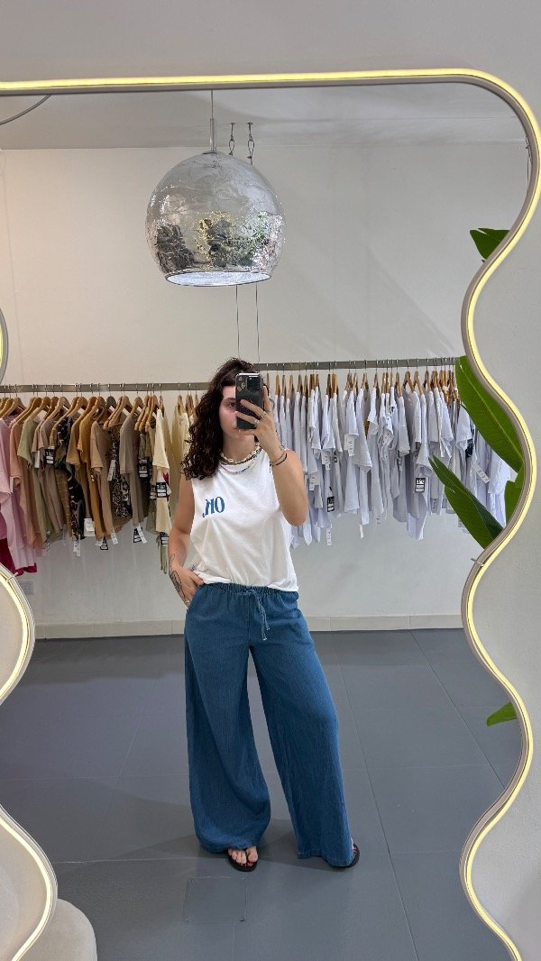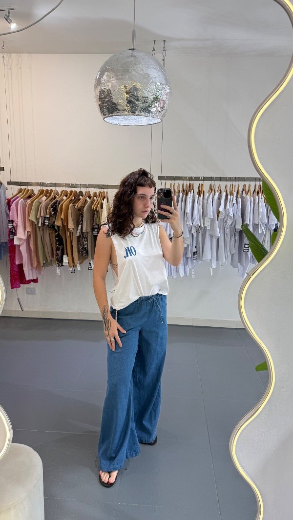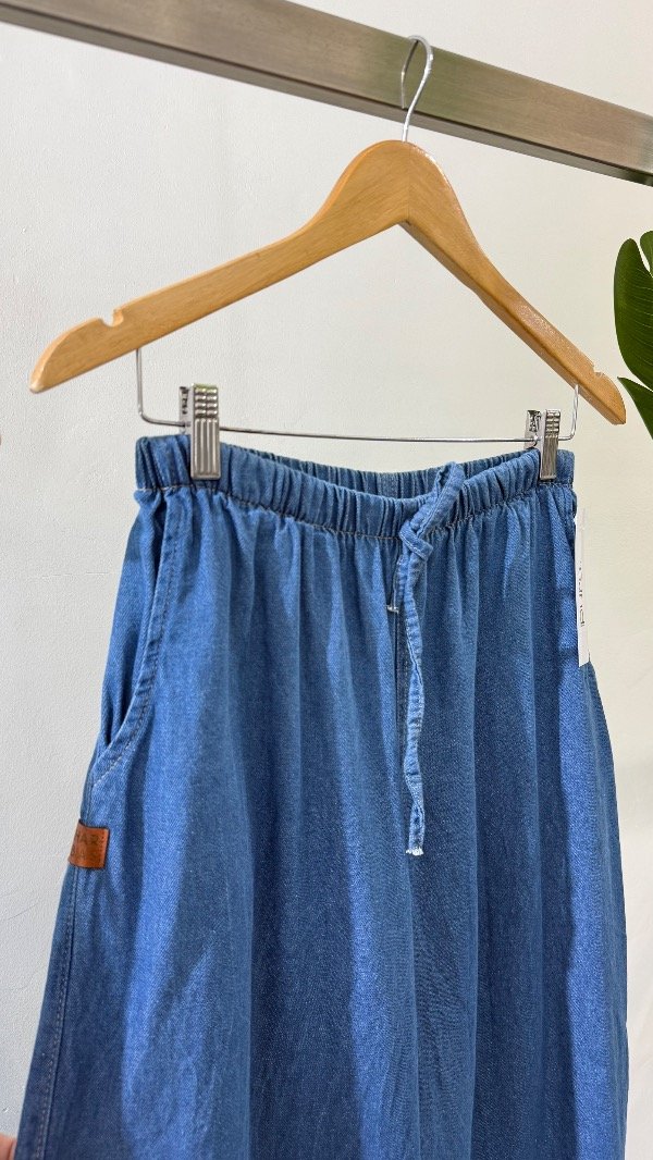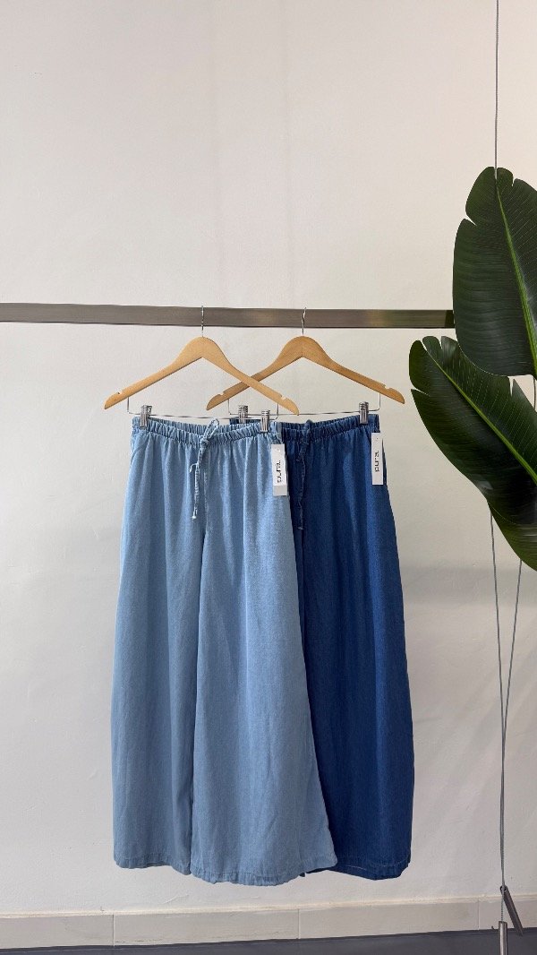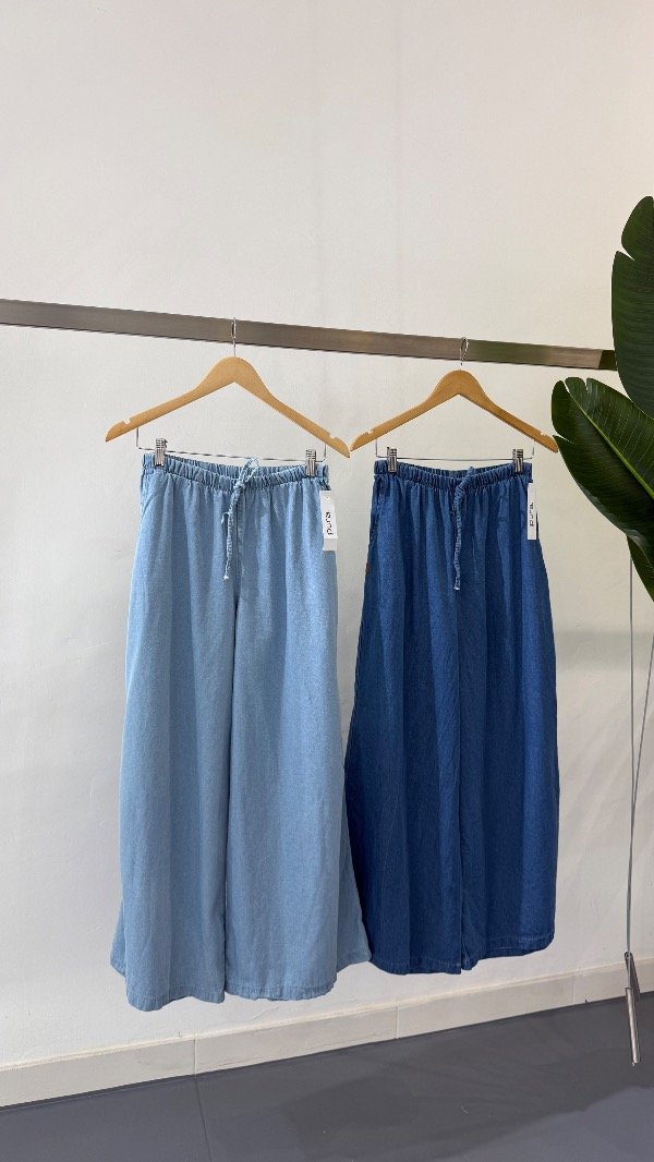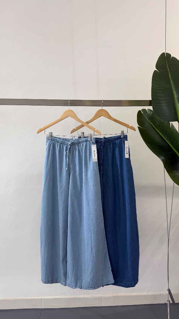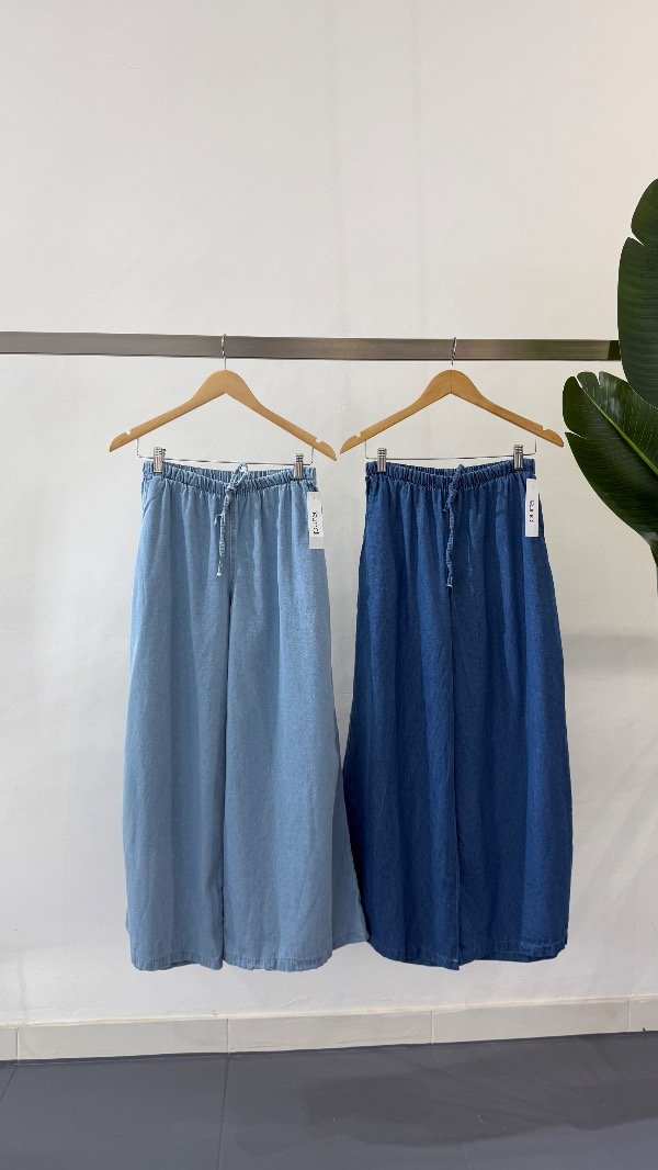 Pantalón palazzo de Jean liviano con elástico en cintura.