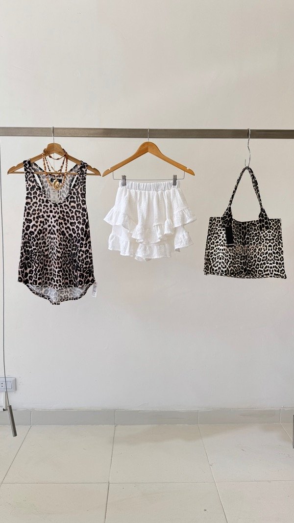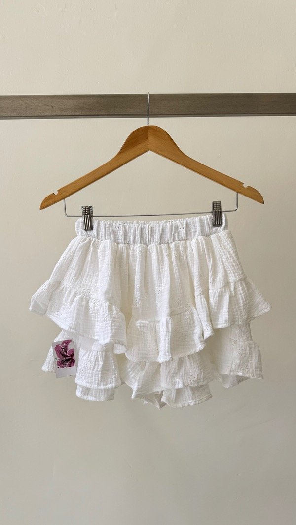 Minifalda con short con volados de broderie, talle unico. Abarca un S/M