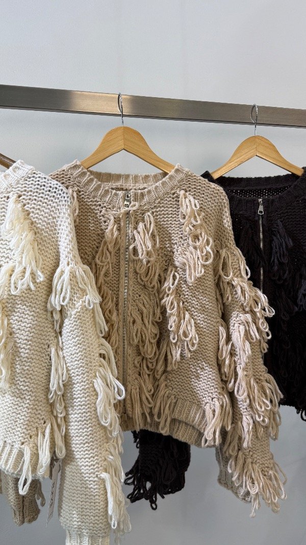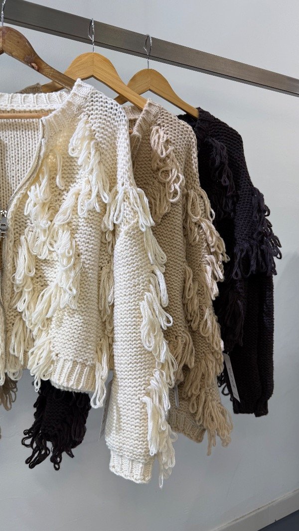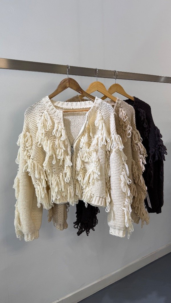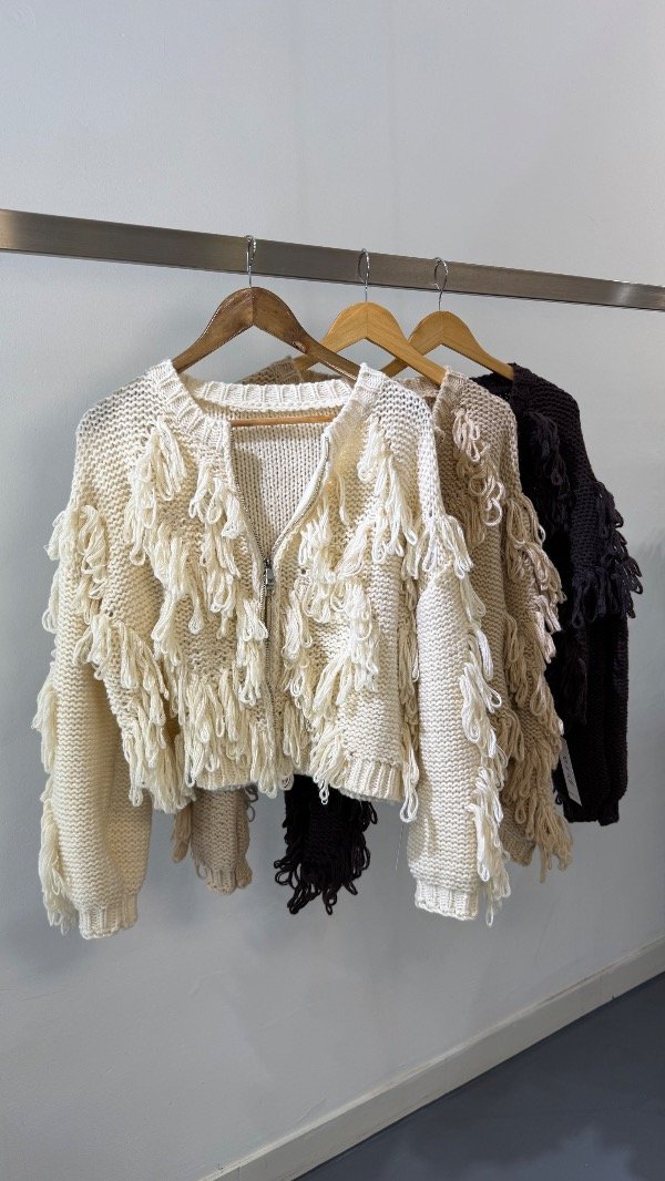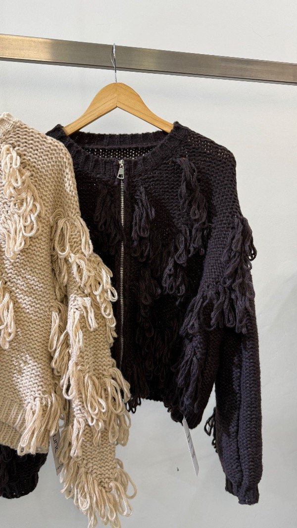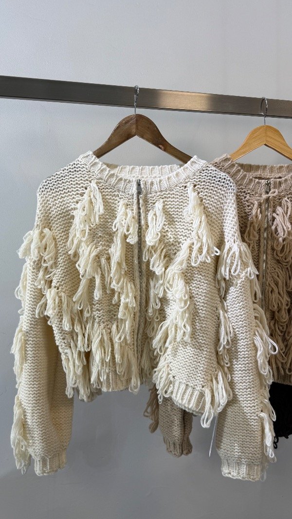 Campera tejida de lana con detalle de flecos en frente y mangas