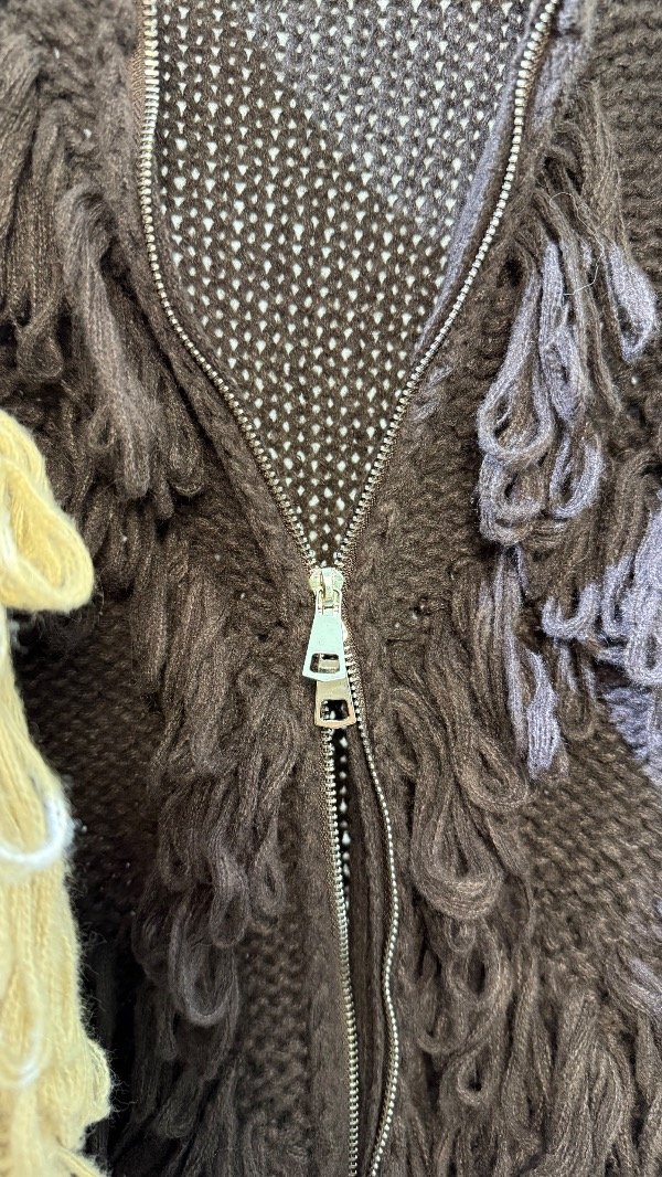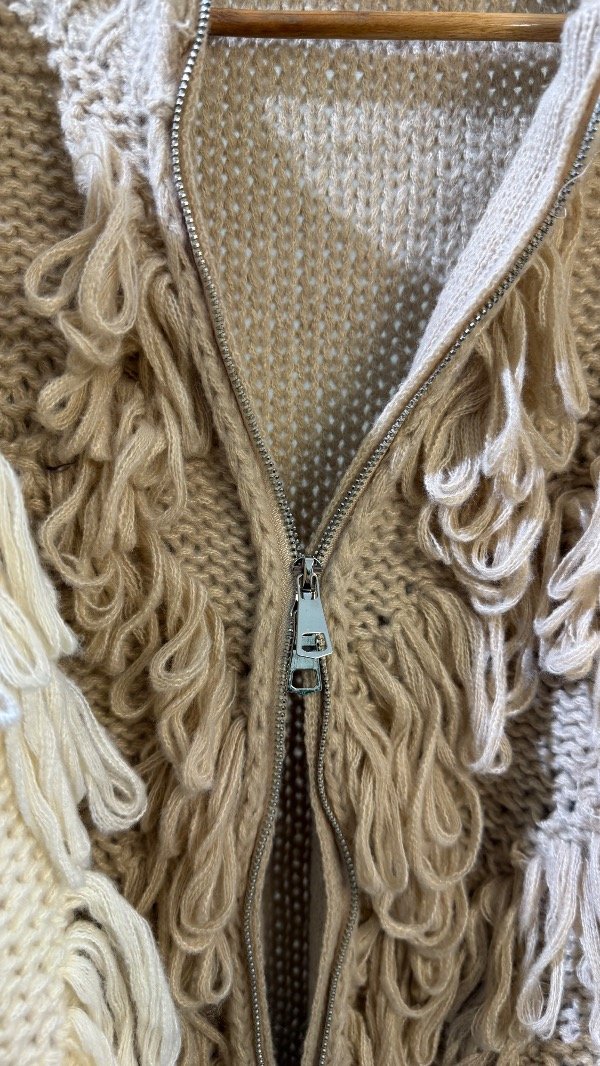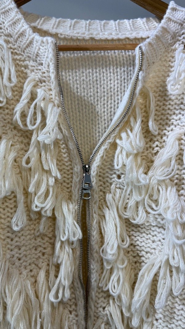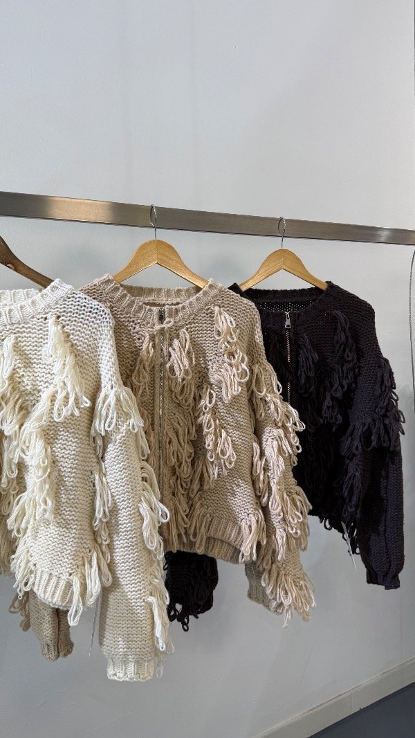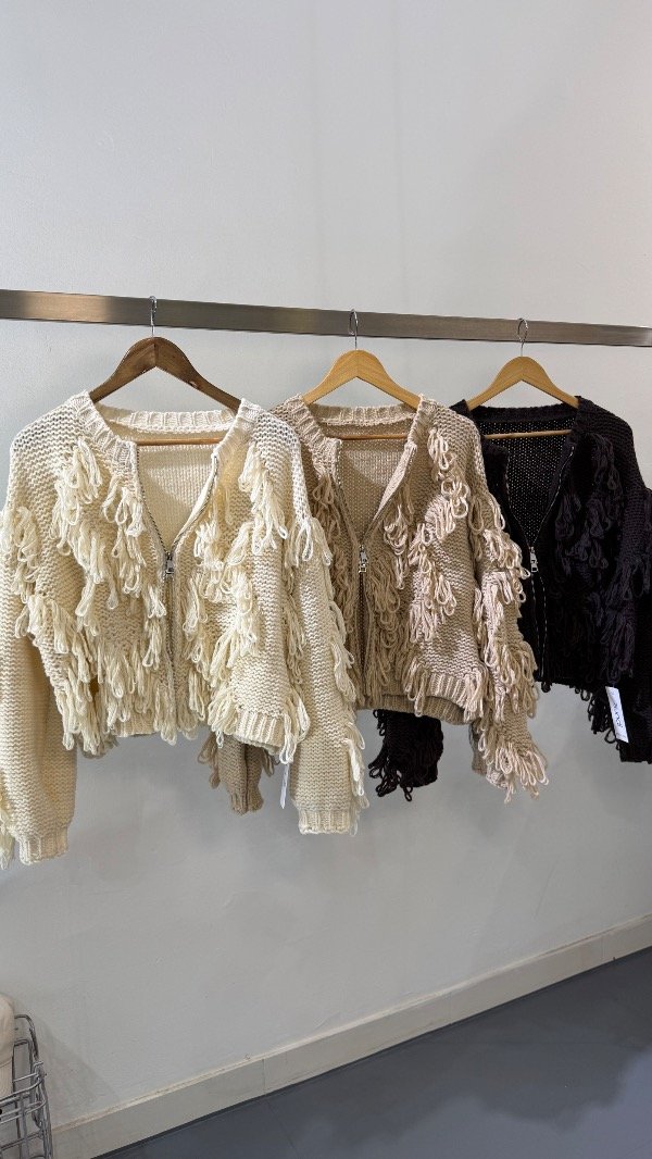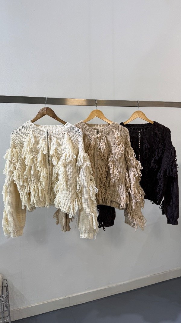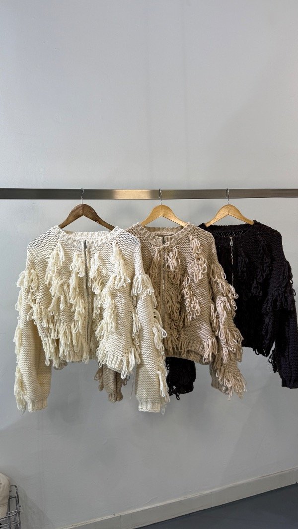 Campera tejida de lana con detalle de flecos en frente y mangas