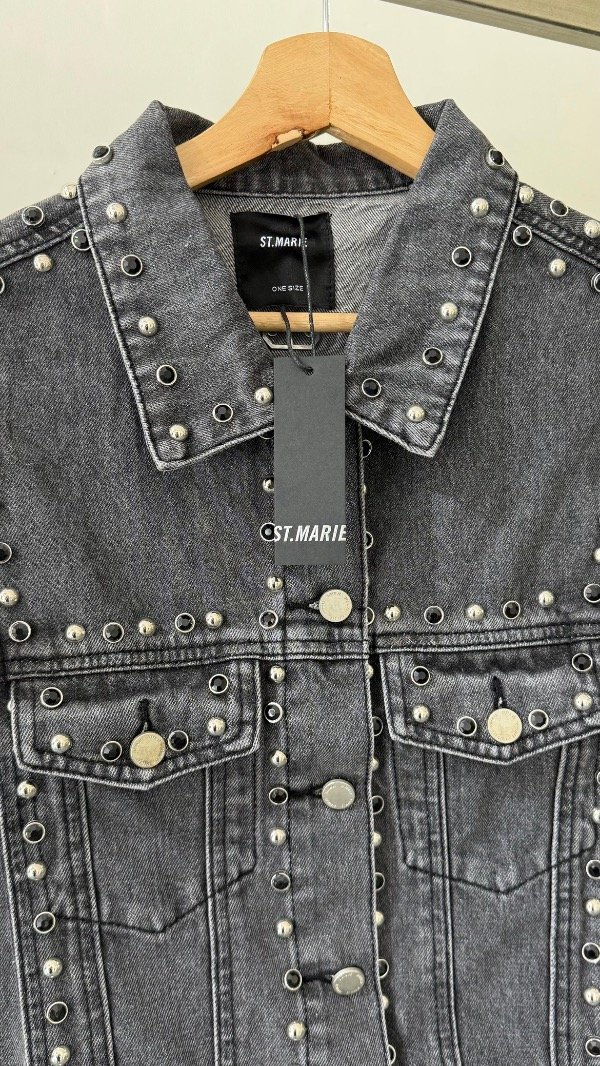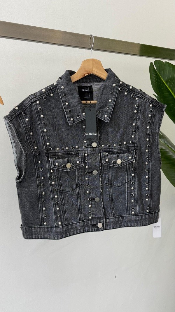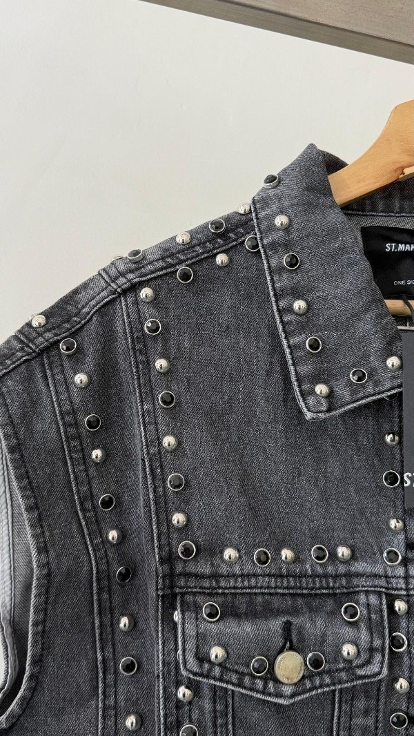 Chaleco de jean con detalles de tachas varias de recorrido vertical.