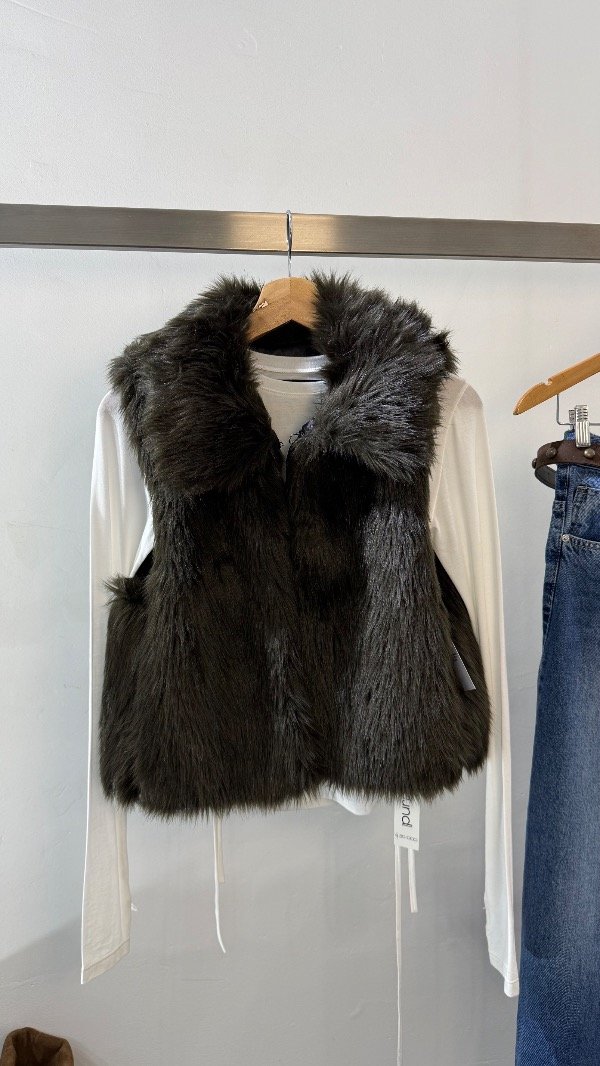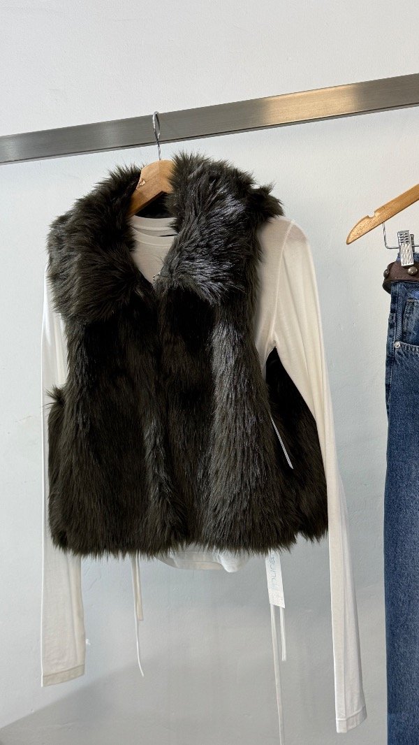 Chaleco símil piel de zorro, con forrería de satén. Calce clásico y cuello amplio.