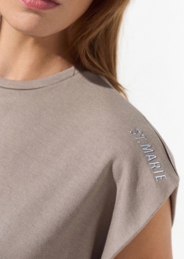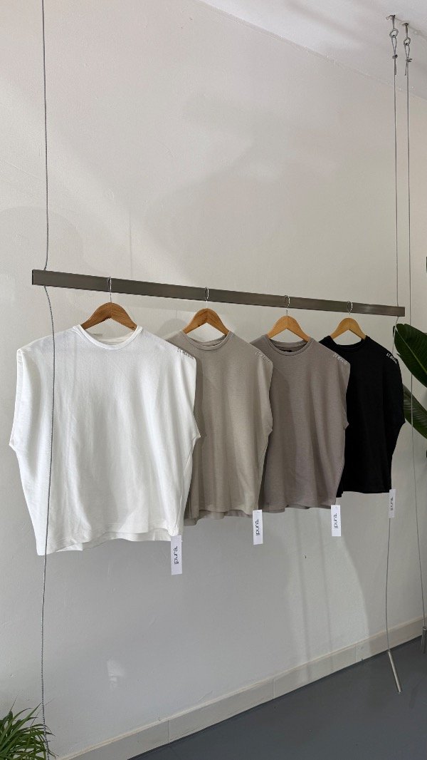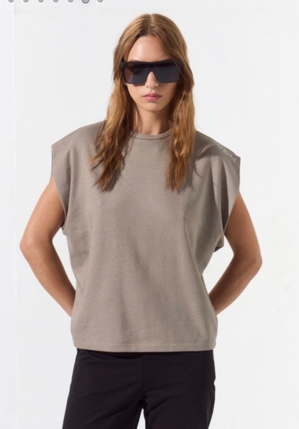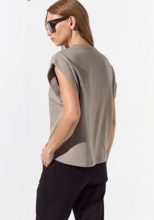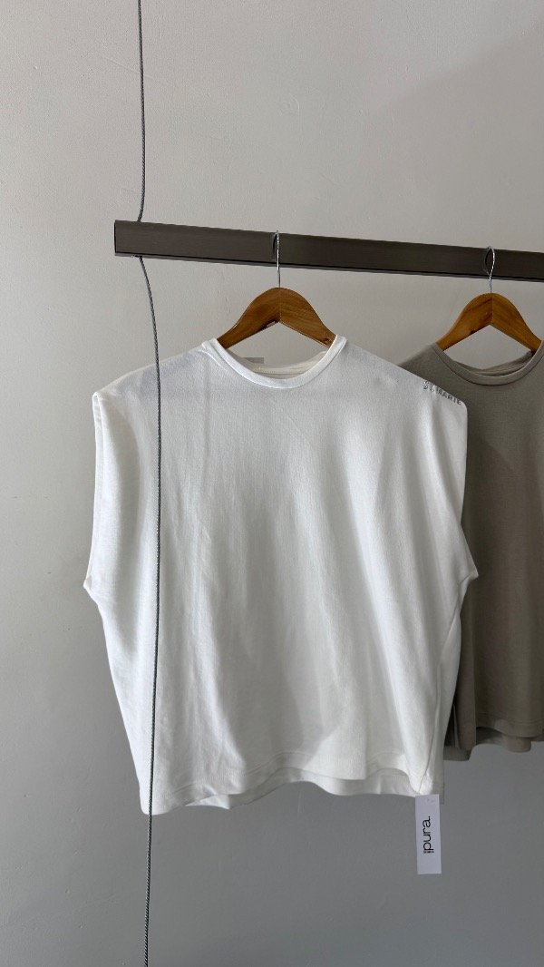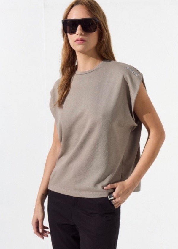 Buzo de rústico liviano sin mangas. Su escote es clásico y su corte es tipo oversize. A modo detalle lleva un tag plateado en el hombro con identificación de marca.