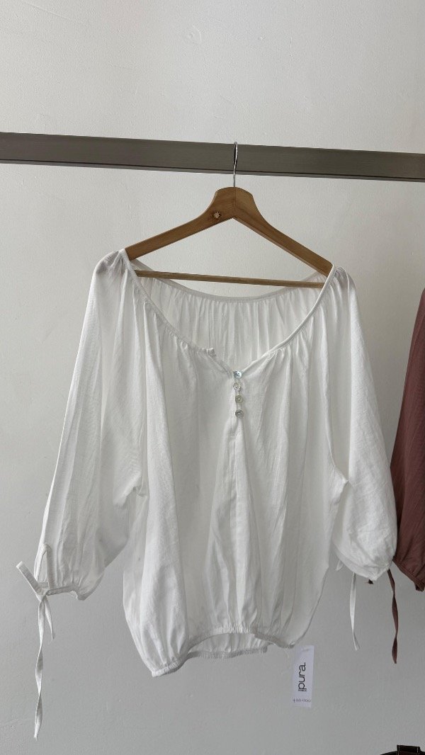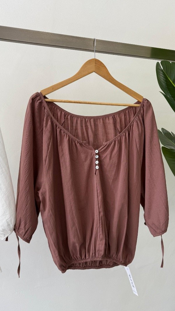 Blusa de lino con mangas 3/4 bombé y botones al frente