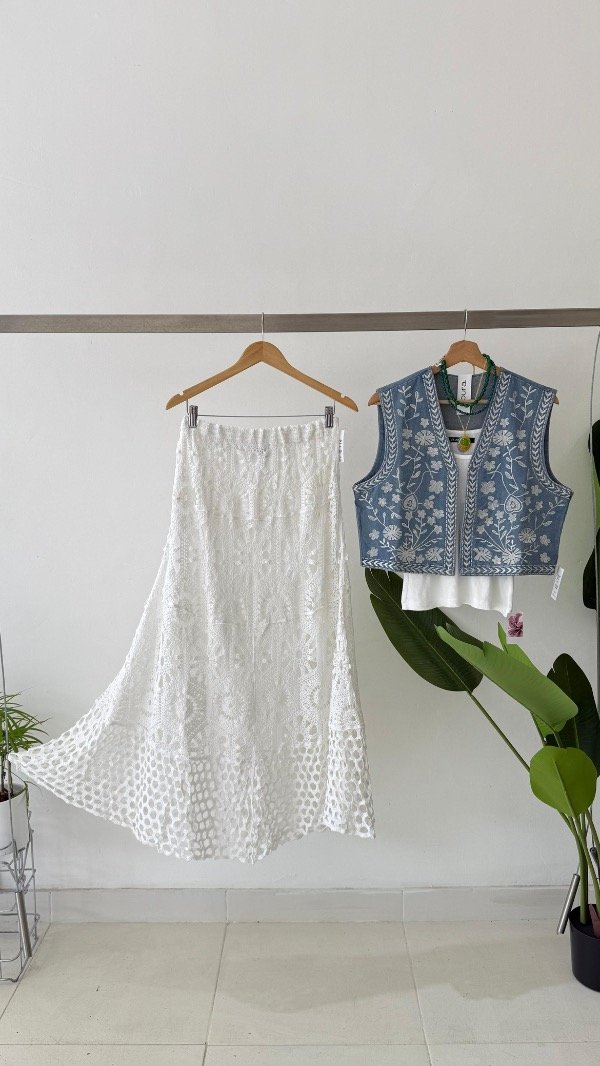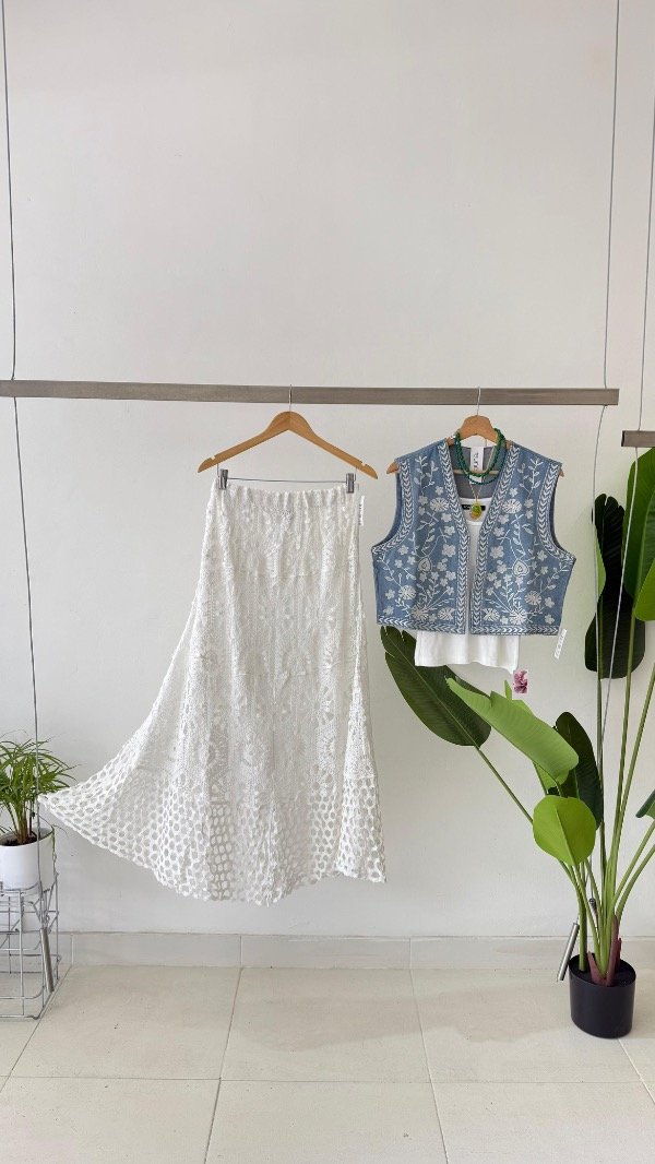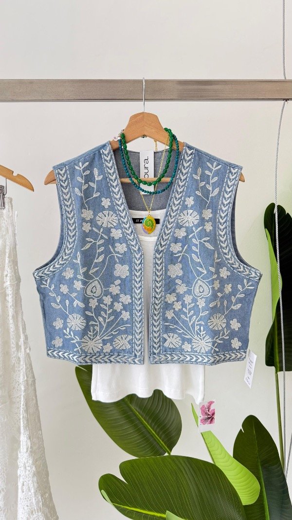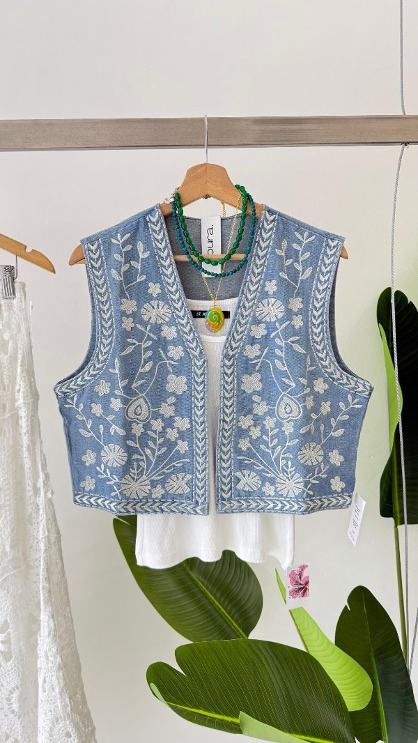 Chaleco de jean, crop con detalle de bordado. Talle único, abarca del S al L
