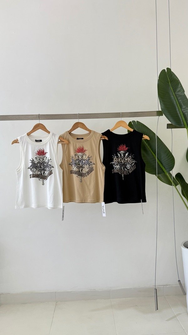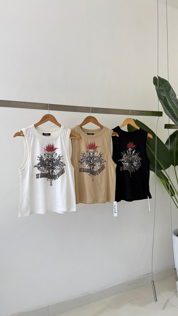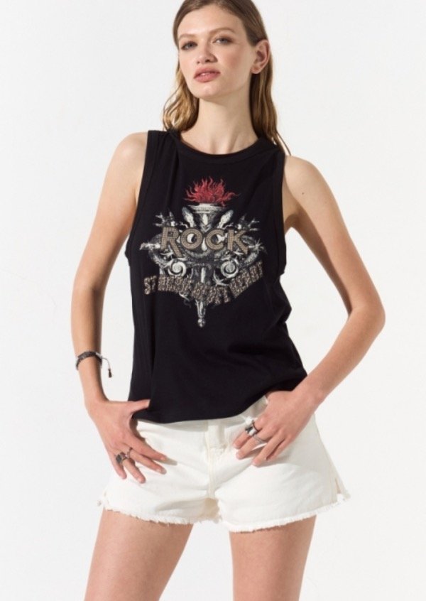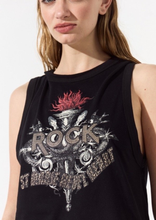 Musculosa corte clásico, confeccionada en jersey de algodón. Lleva estampa central con leyenda "ROCK", y recursos mixtos de tintas. En la espalda lleva grifa de marca.