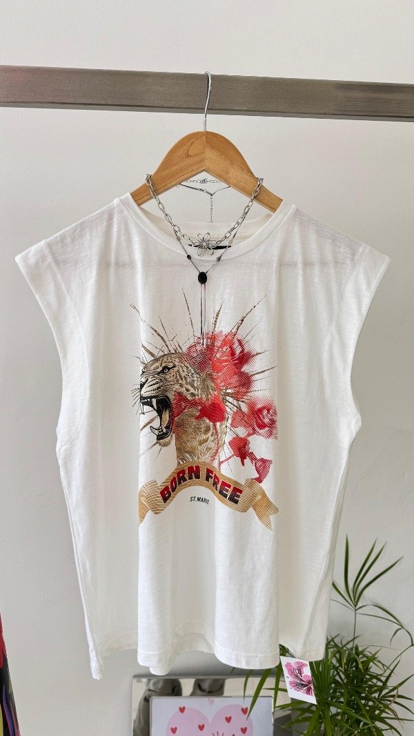 Musculosa de jersey flamenco, con escote a la base y sisas terminadas con vista interna. Lleva estampa central exclusiva e identificación de marca en escote de espalda