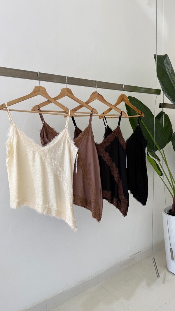 Musculosa irregular lencera de seda con puntilla. Talle único, abarca de un S al L