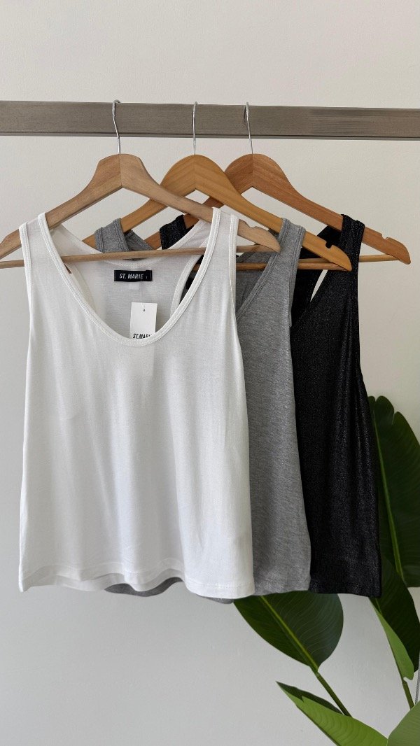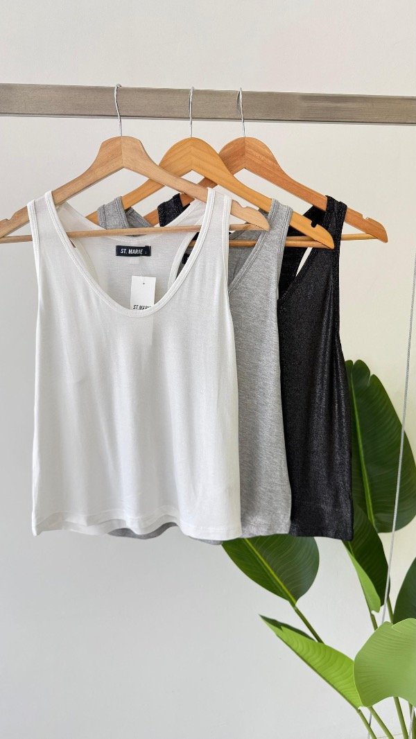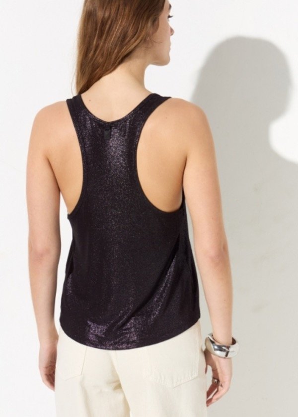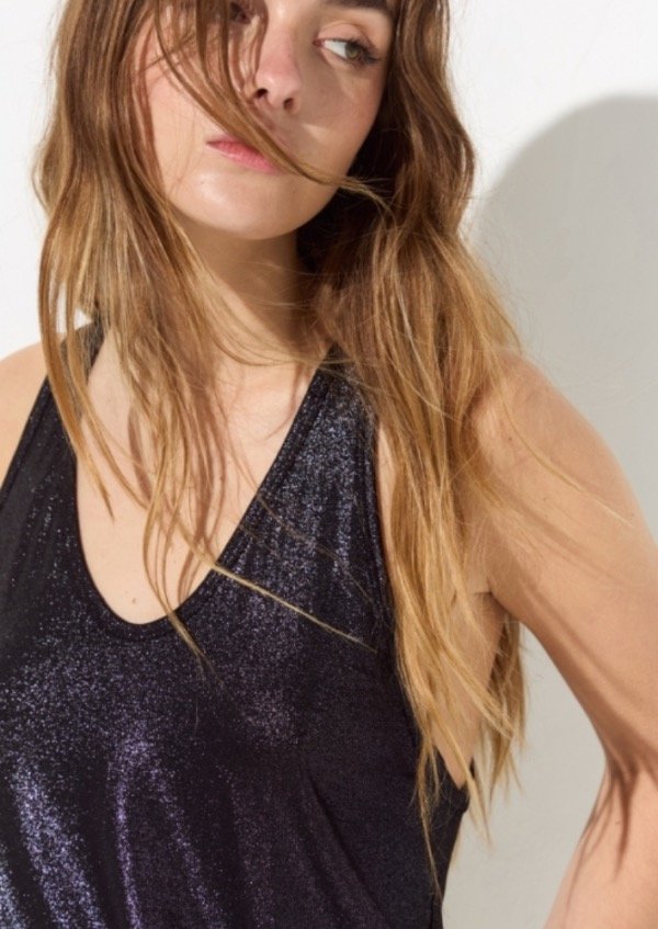 Musculosa de foil con escote u, su espalda es cavada y tanto en sisa como escote lleva guía al bies para otorgar mejor terminación a la prenda. A modo de detalle en su espalda se le coloco un colgante con la identificación de la marca.