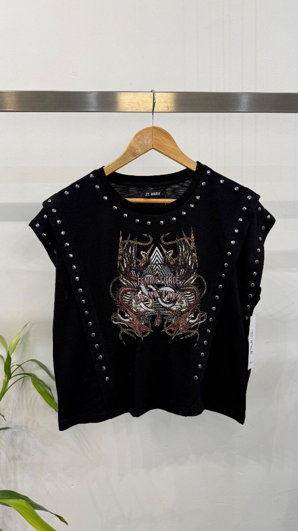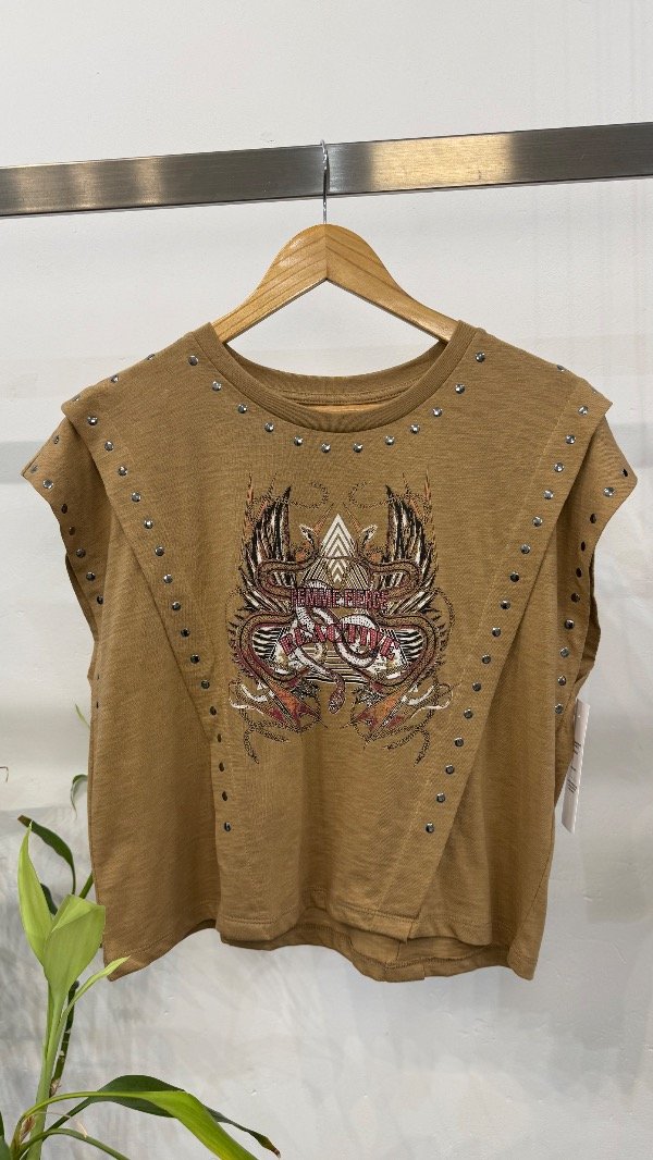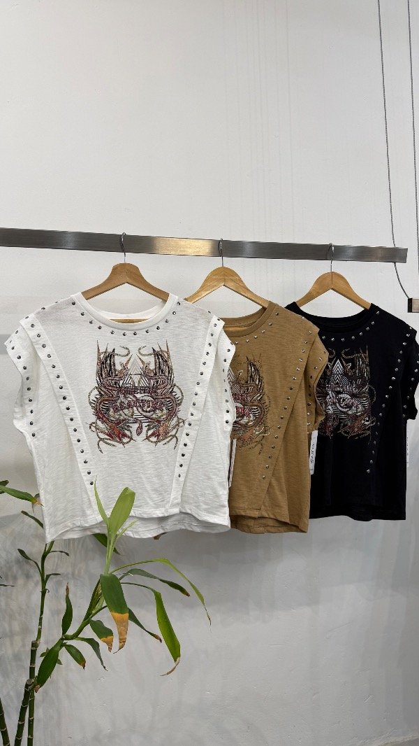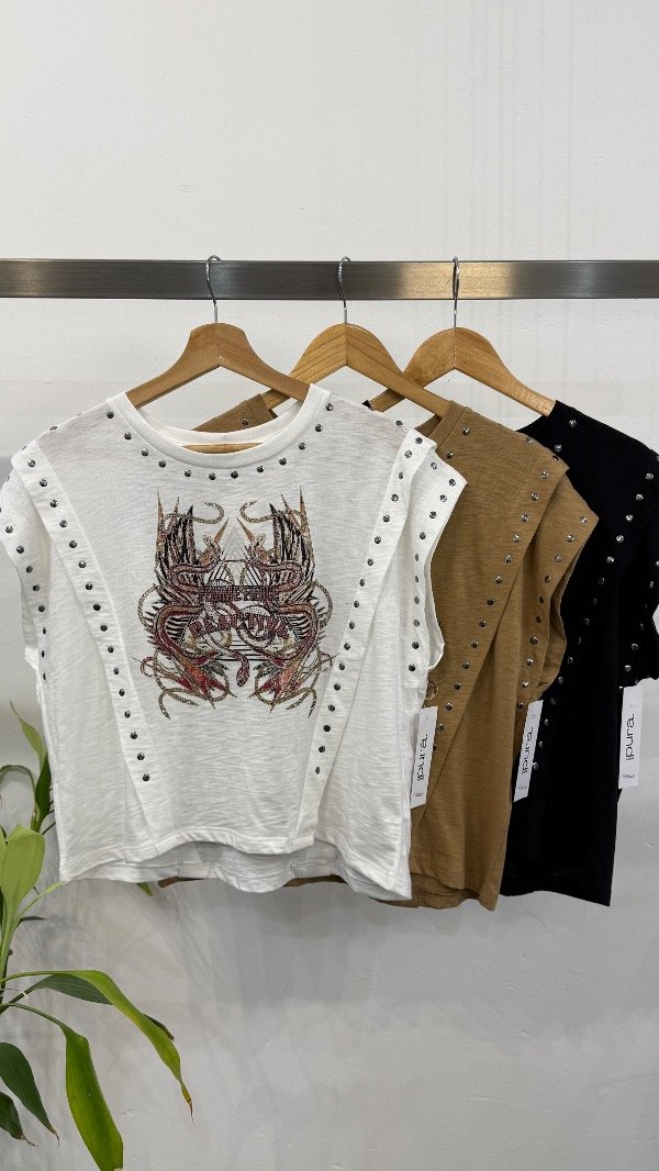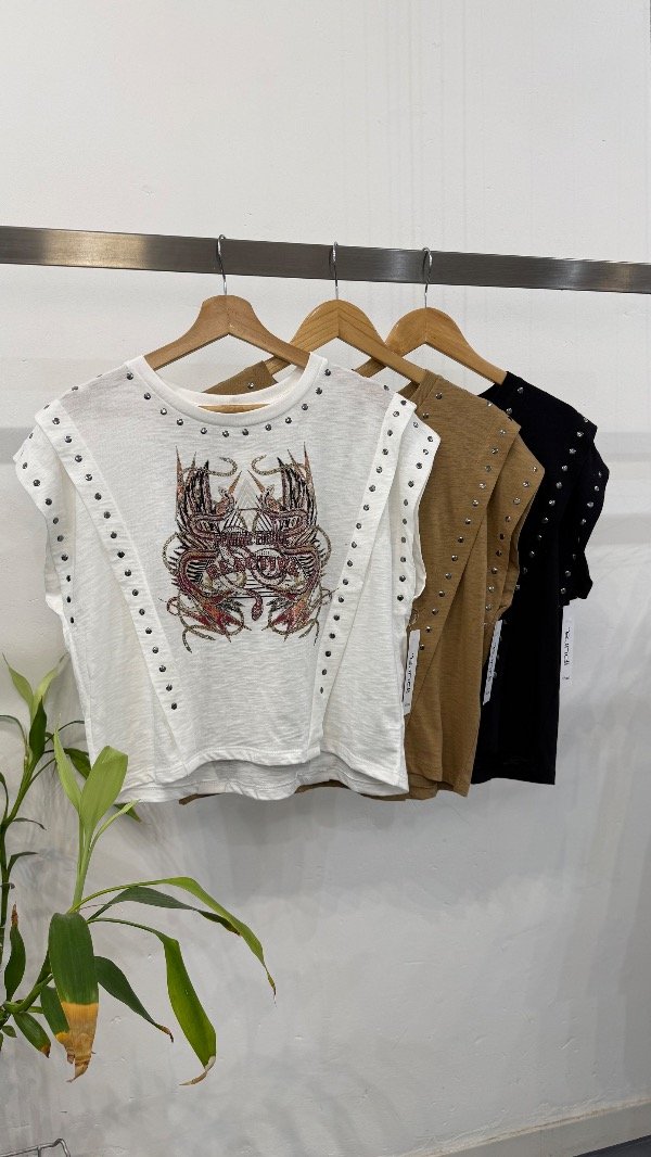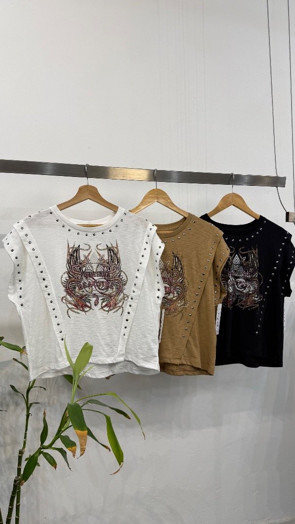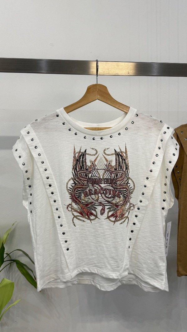 Remera en jersey flamé con estampa delantera exclusiva, detalle de tachas en recortes.