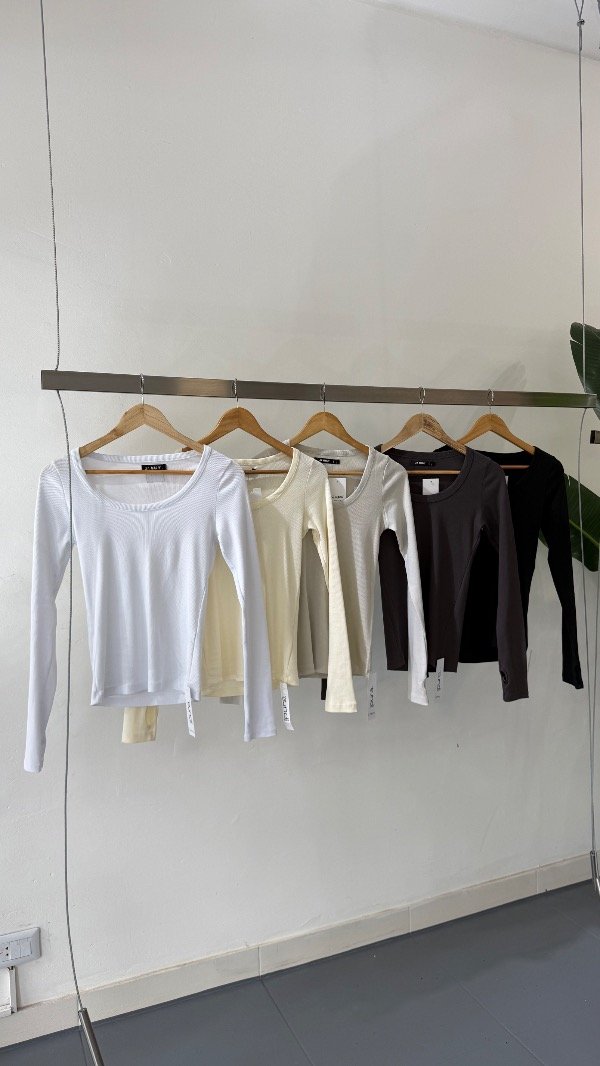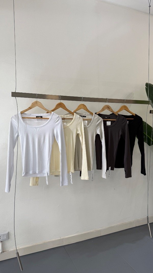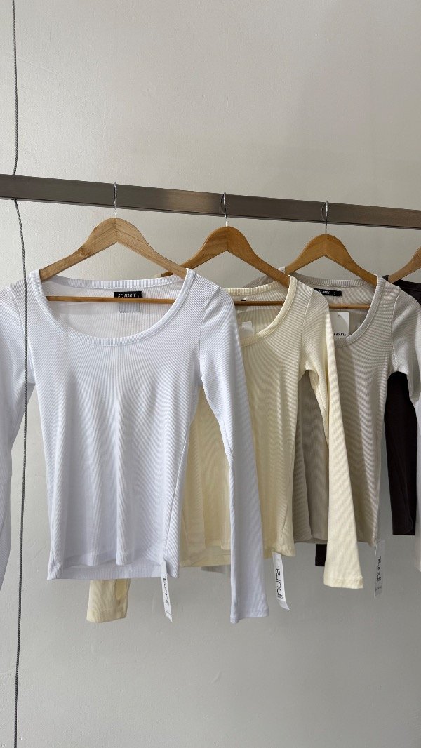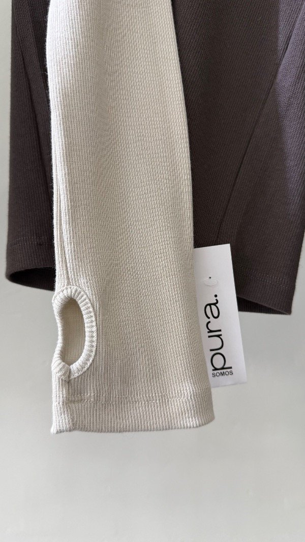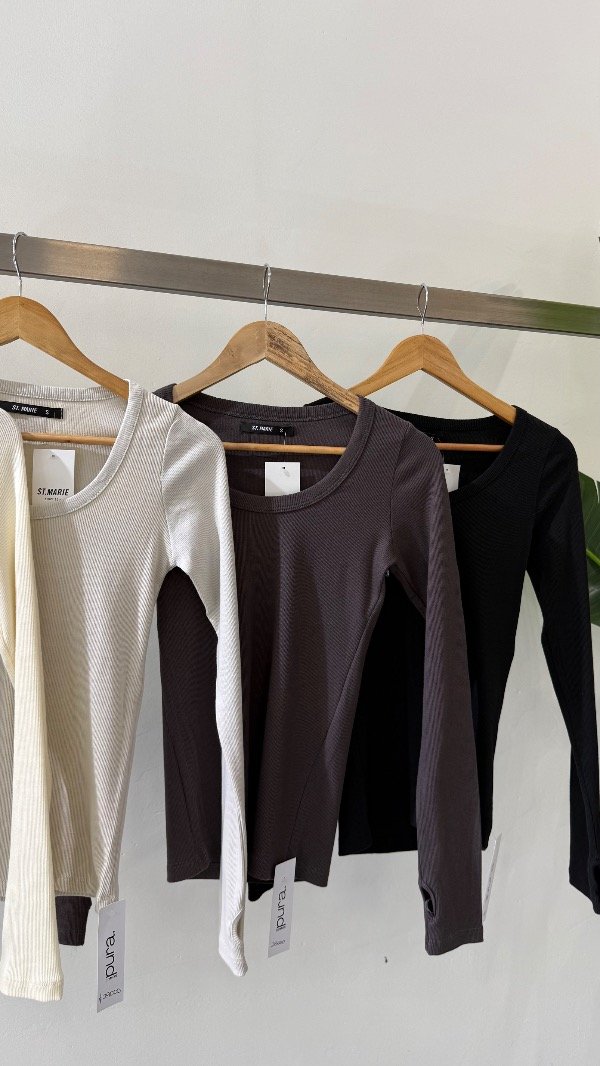 Remera de morley con ly, escote en U, manga larga con detalle dedo pasador y etiqueta personalizada en espalda.