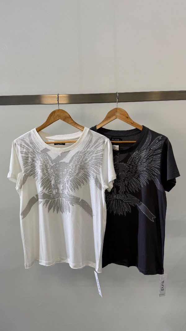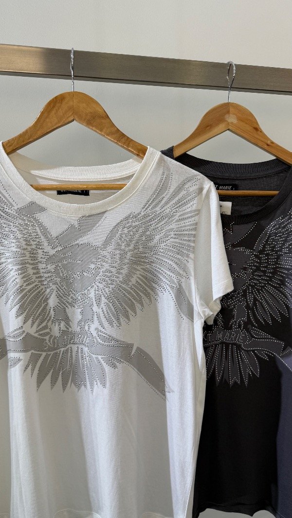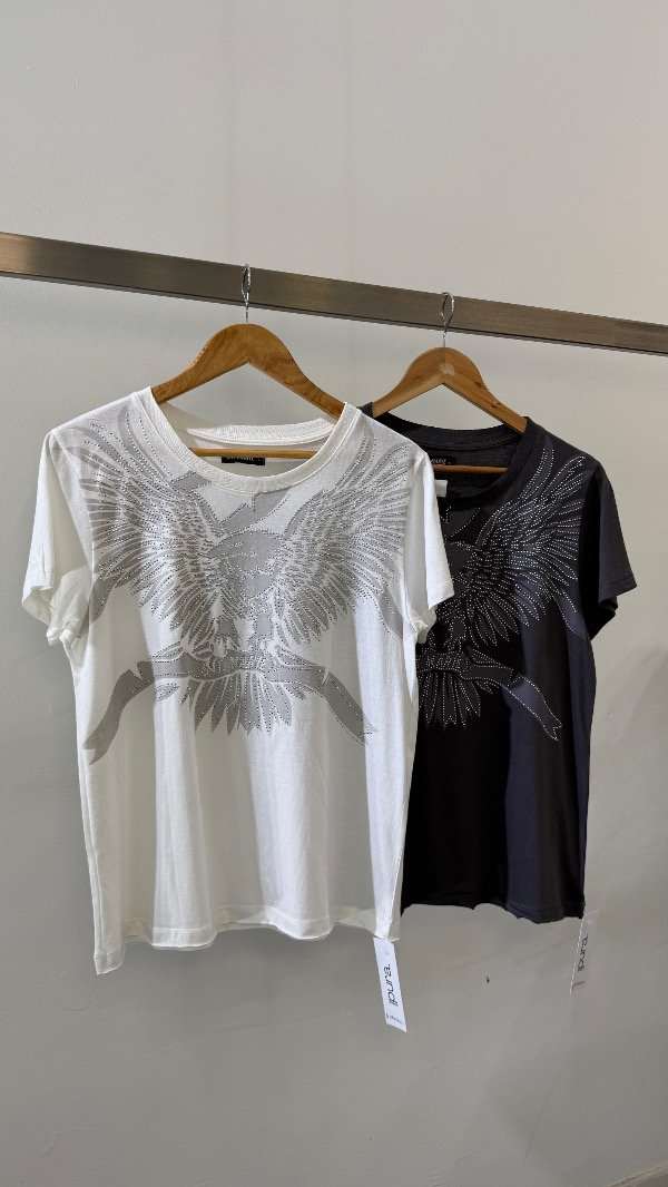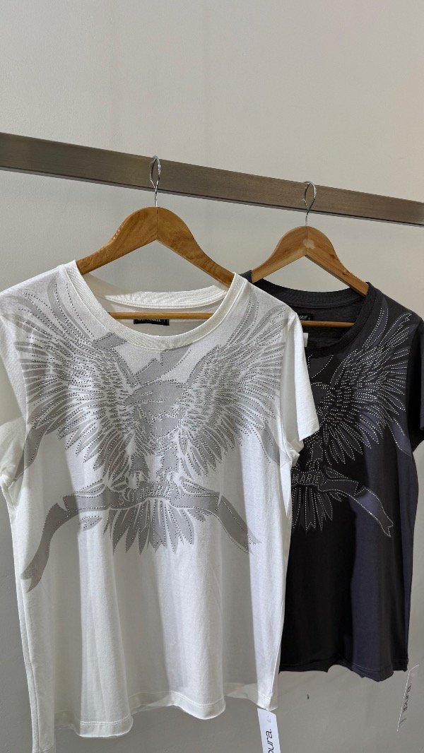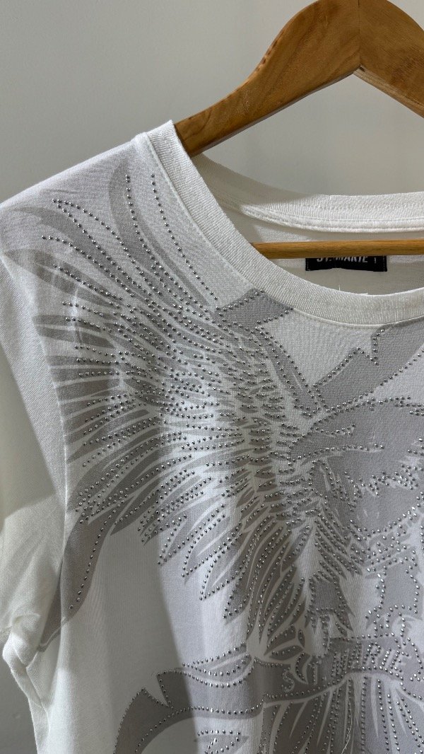 Remera escote redondo estampada, con detalle de hotfix. Lleva complemento en escote y en el centro de la espalda una grifa con identificación de marca.