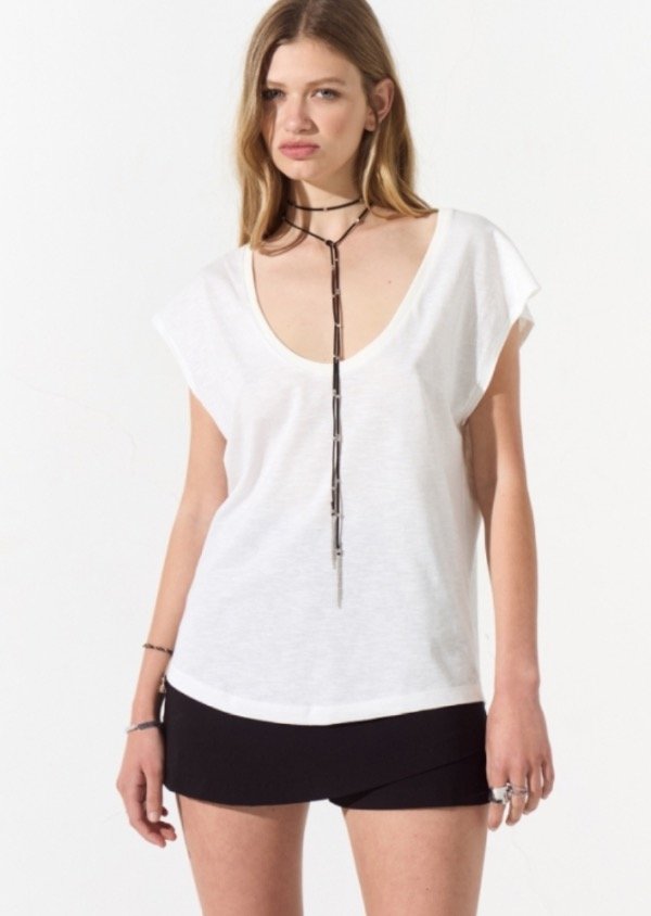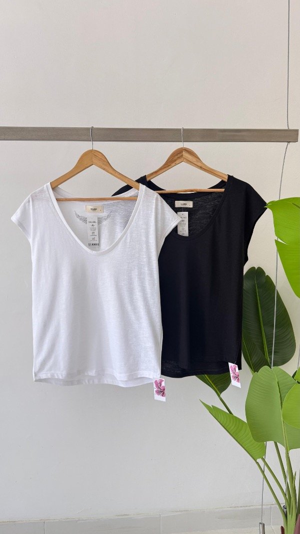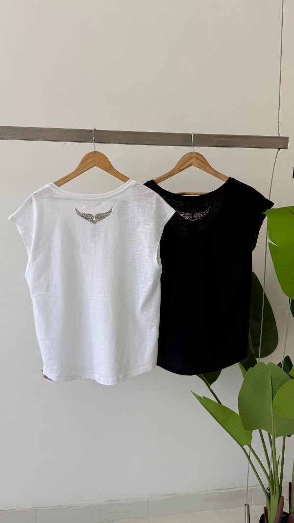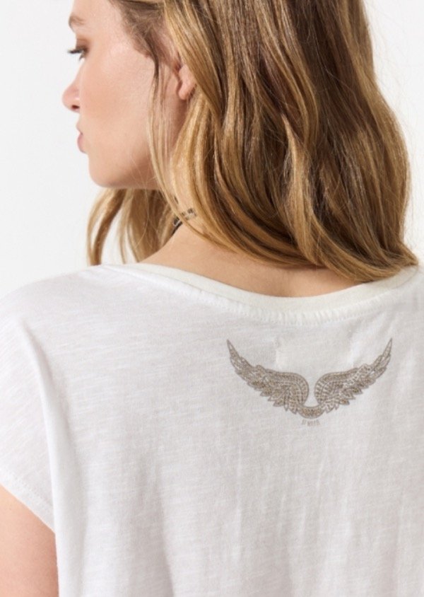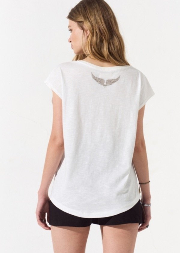 Remera de flame, posee un escote en v terminado en complemento del mismo tono que la tela base, en el centro de su espalda lleva un hotfix de alas con la identificación de marca.
