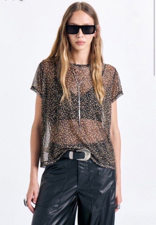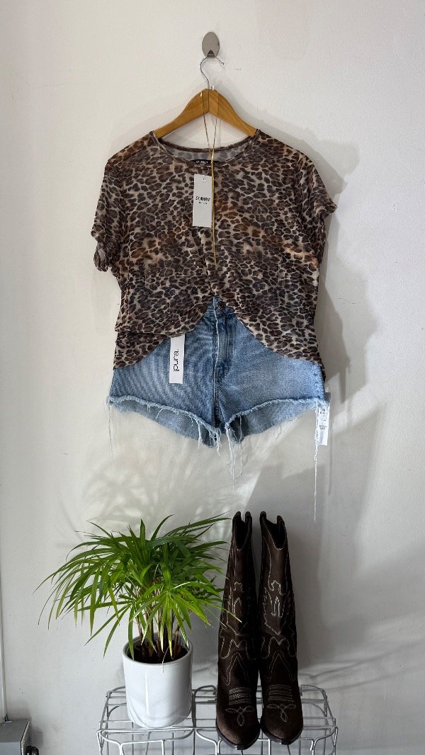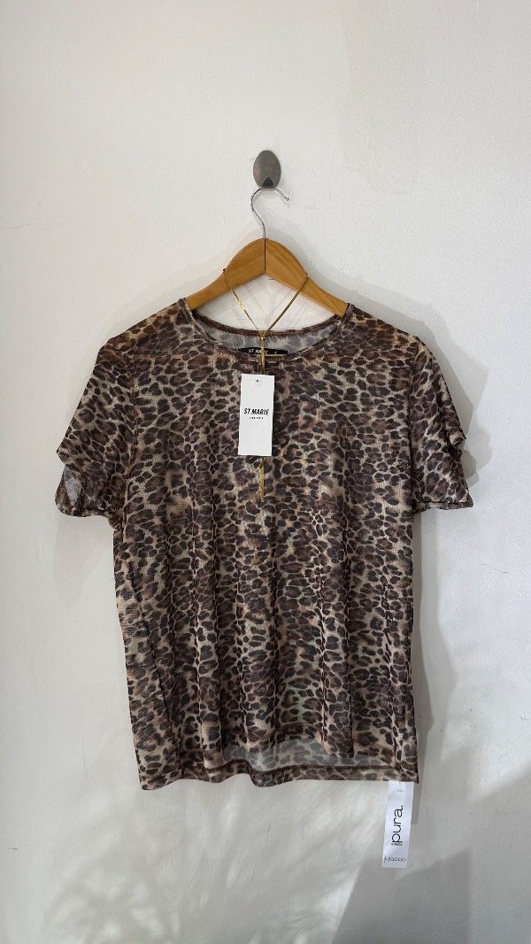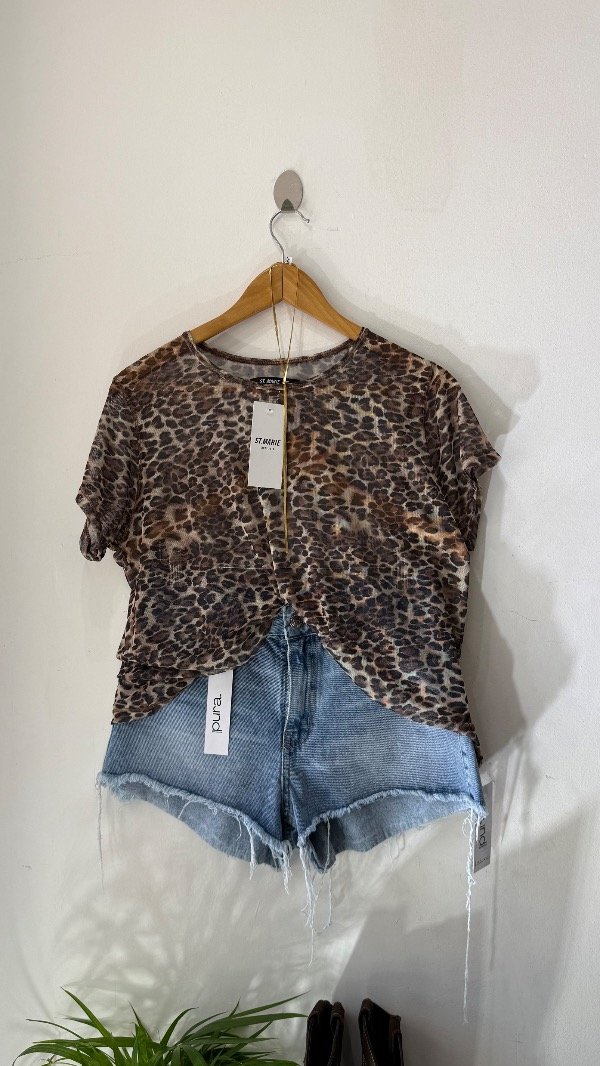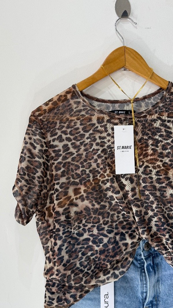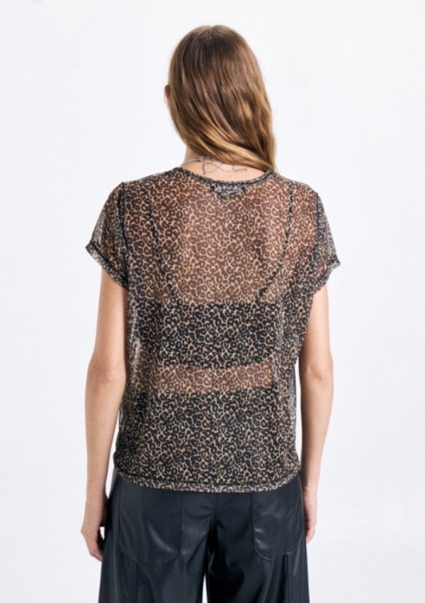 Remera manga corta, de escote redondo, confeccionada en microtul con estampado full de cheeta. En la espalda superior lleva chapita de zamak con identificación de marca.