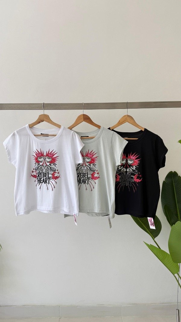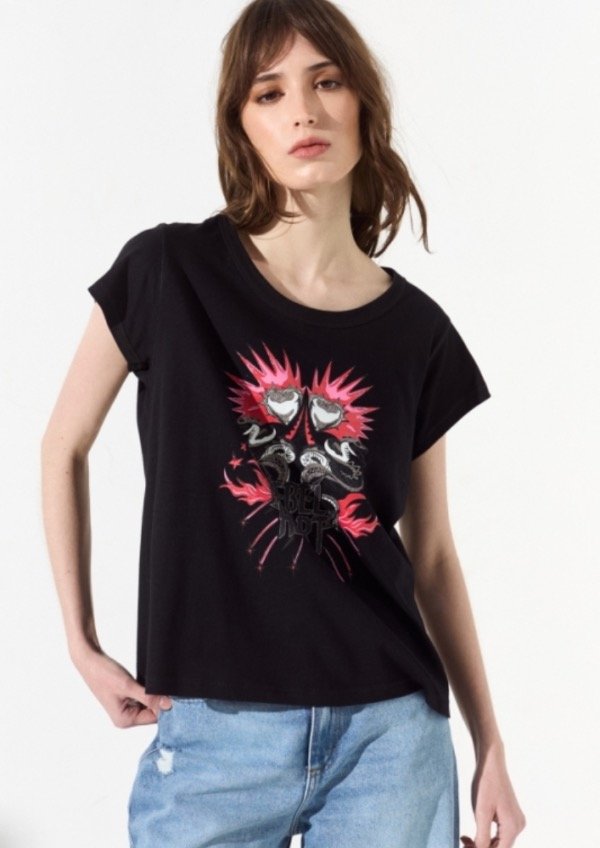 Remera estampada de corte clásico, lleva un escote redondo y zócalo en sus mangas. En el centro de la espalda lleva una grifa con la identificación de la marca.
