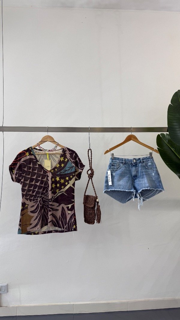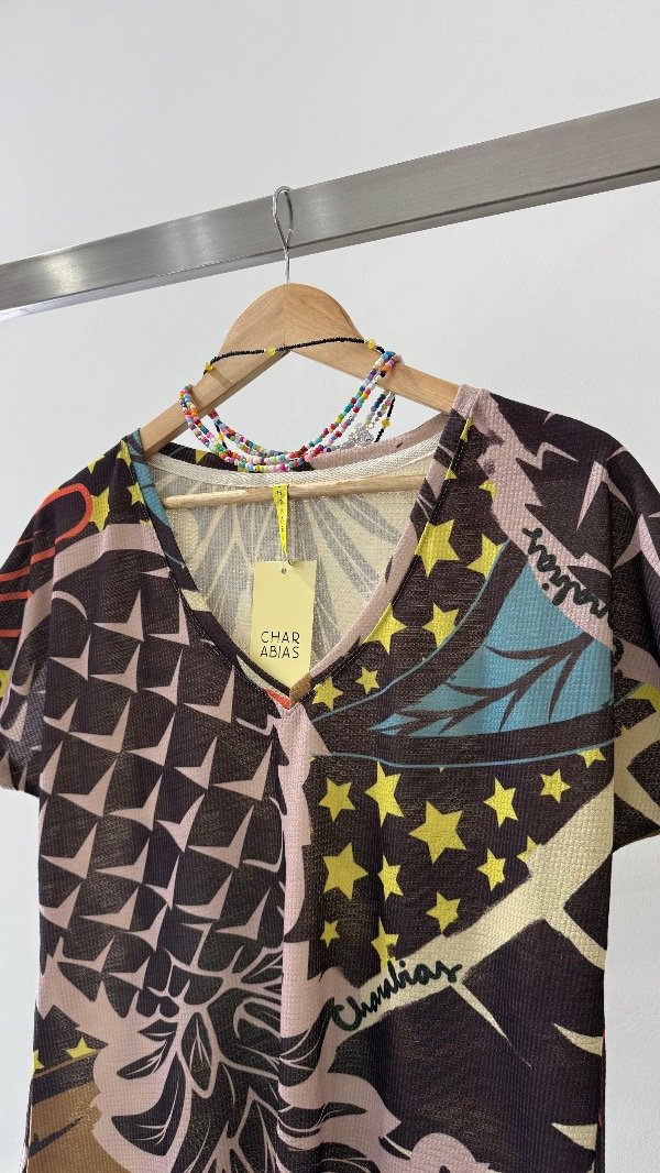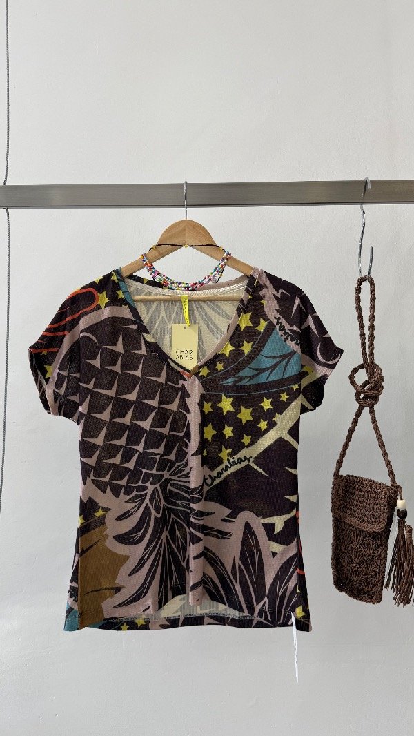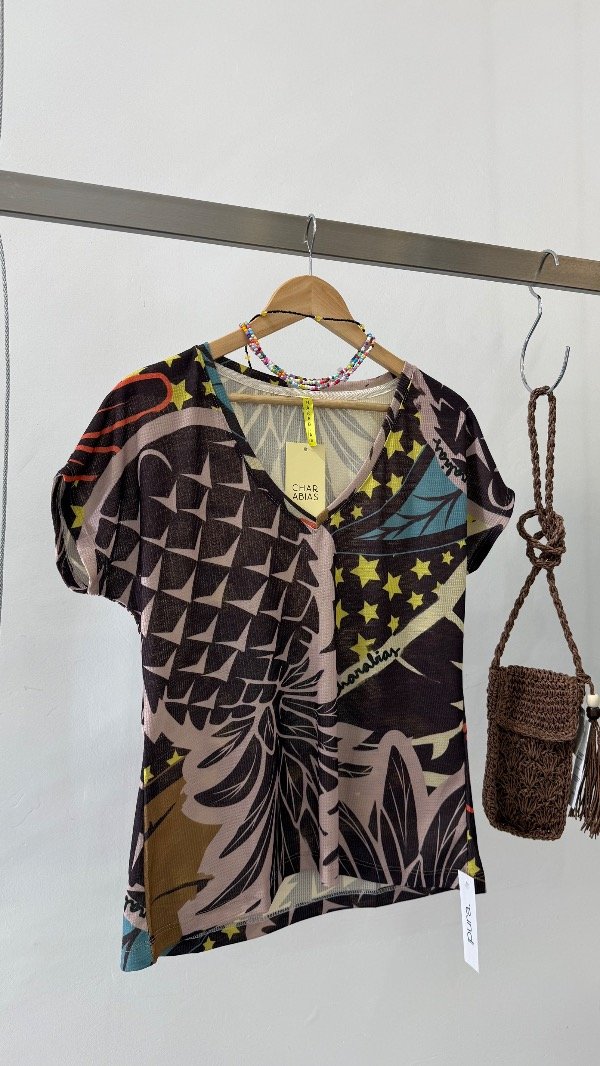Remera escote en V de Waffle estampado. Talle único, abarca de un S al L
