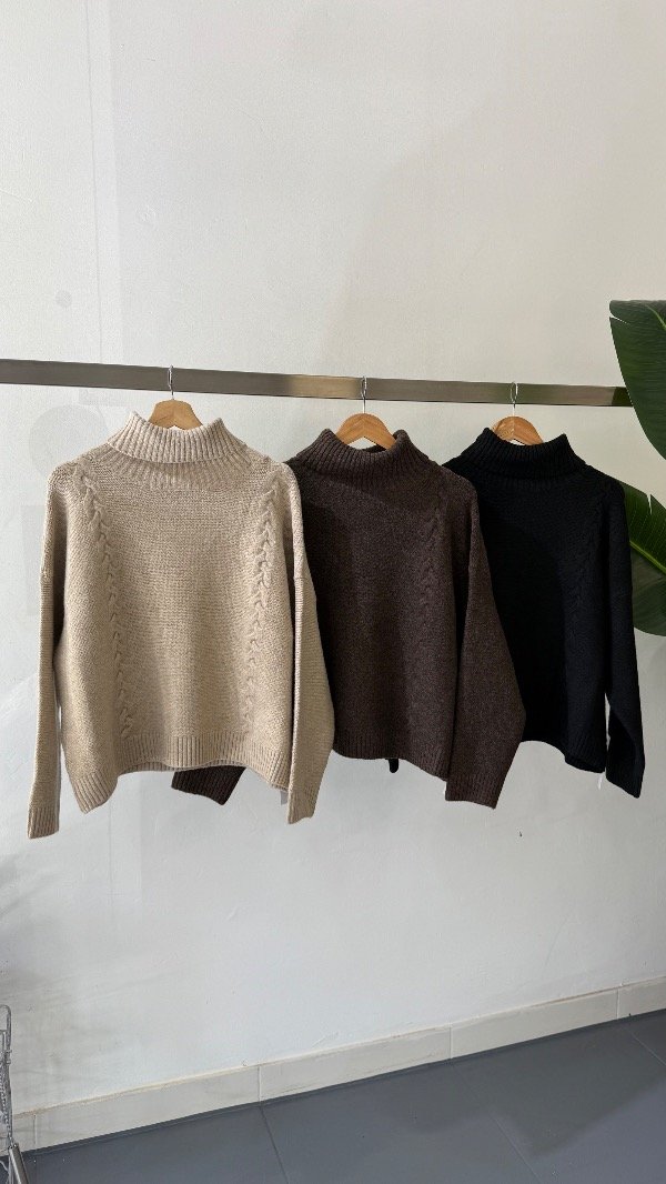 Sweater tejido de calce relajado, con cuello polera y detalle trenzado.