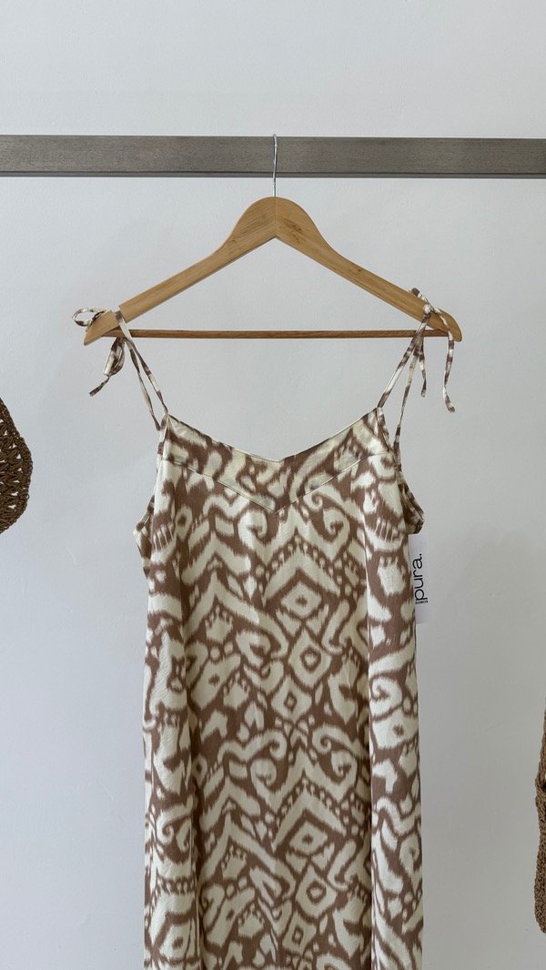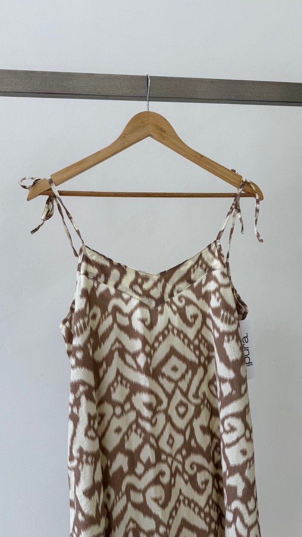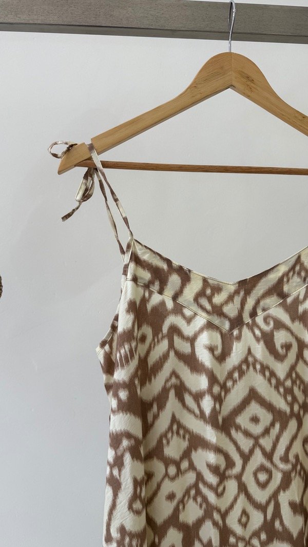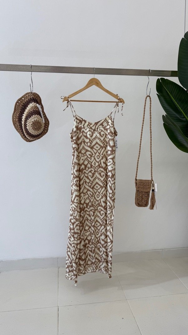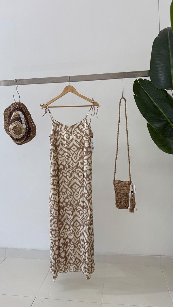 Vestido de voile rayón largo al piso estampado. Breteles regulable. Talle único, abarca de un S al L