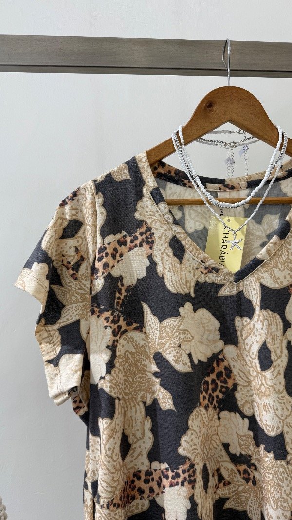 Vestido de algodón estampado escote en V, largo a la rodilla con bolsillos.Talle único, abarca de un S al XL