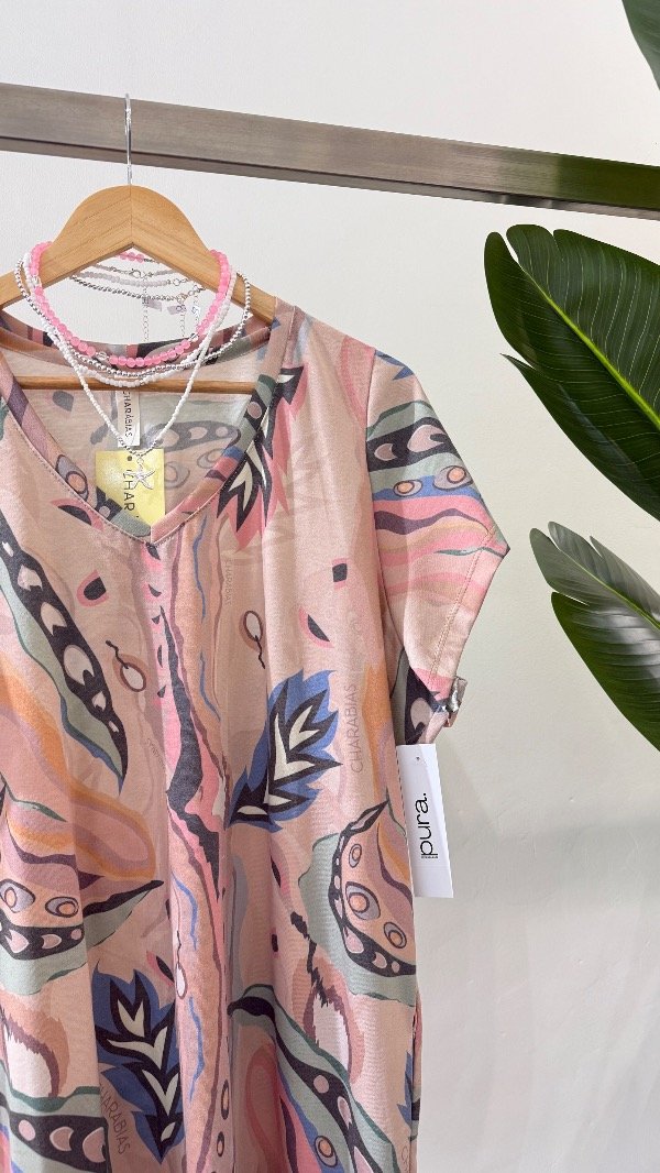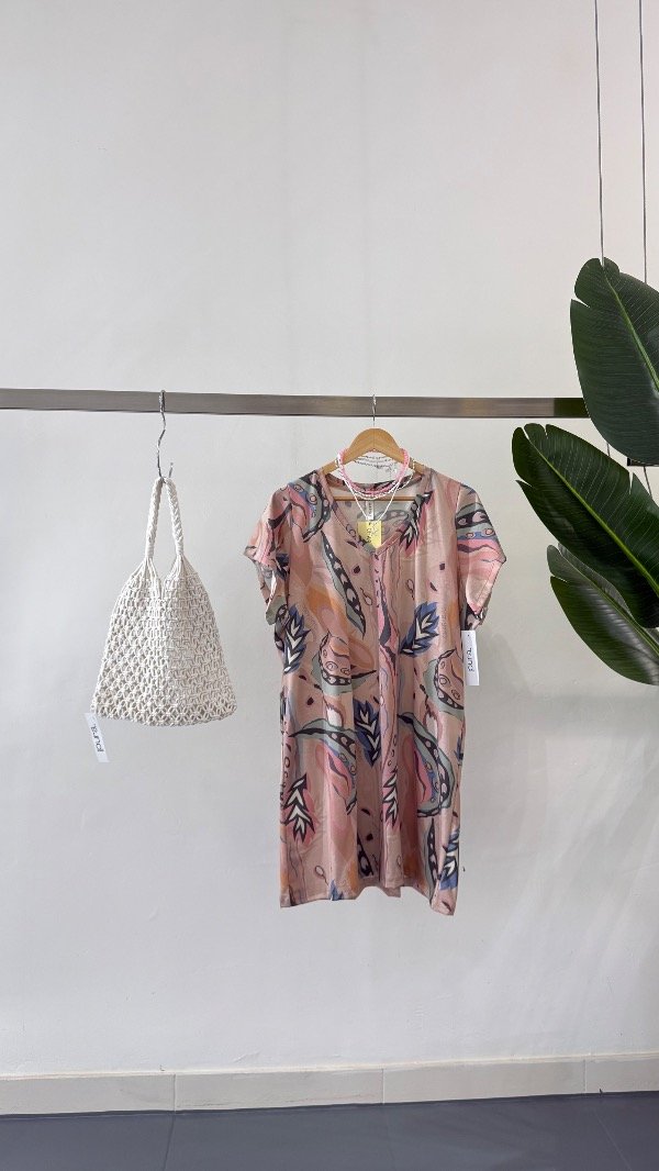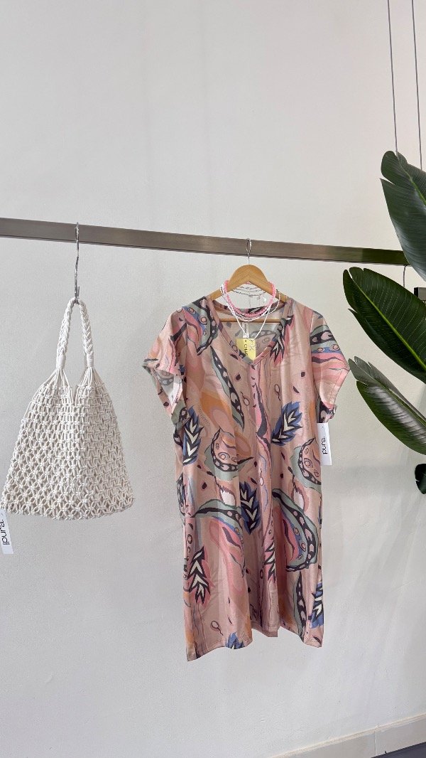 Vestido de algodón estampado escote en V, largo a la rodilla con bolsillos.Talle único, abarca de un S al XL