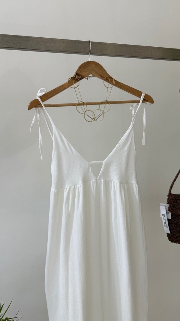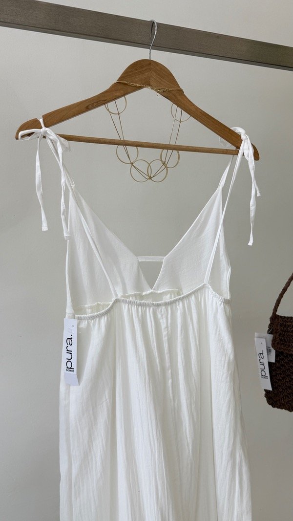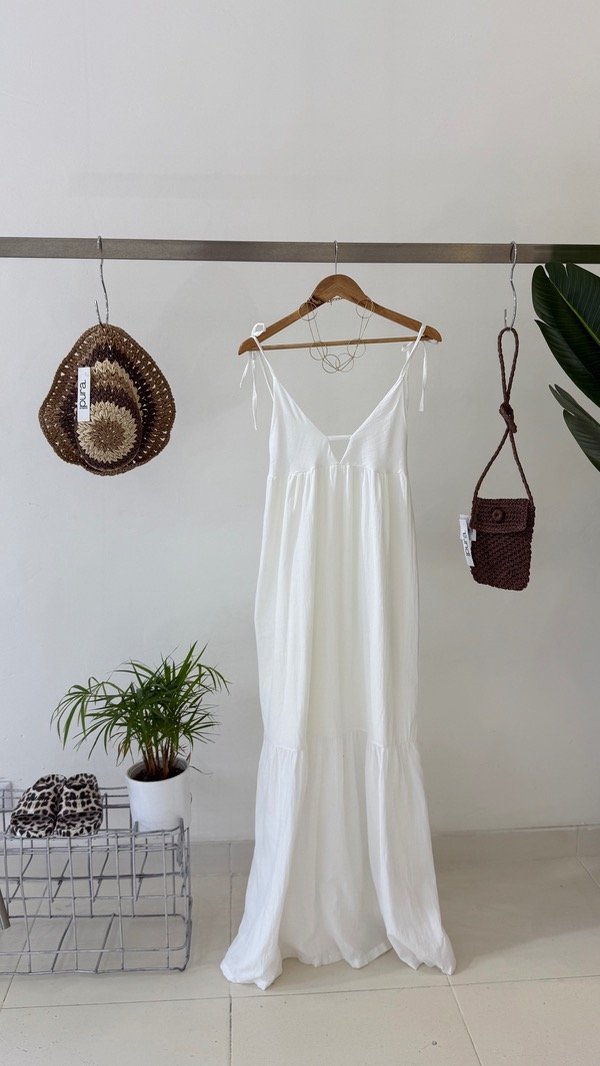 Vestido de bambula forrado largo al piso con volado inferior, espalda baja con elástico y escote pronunciado. Talle único, abarca un M/L