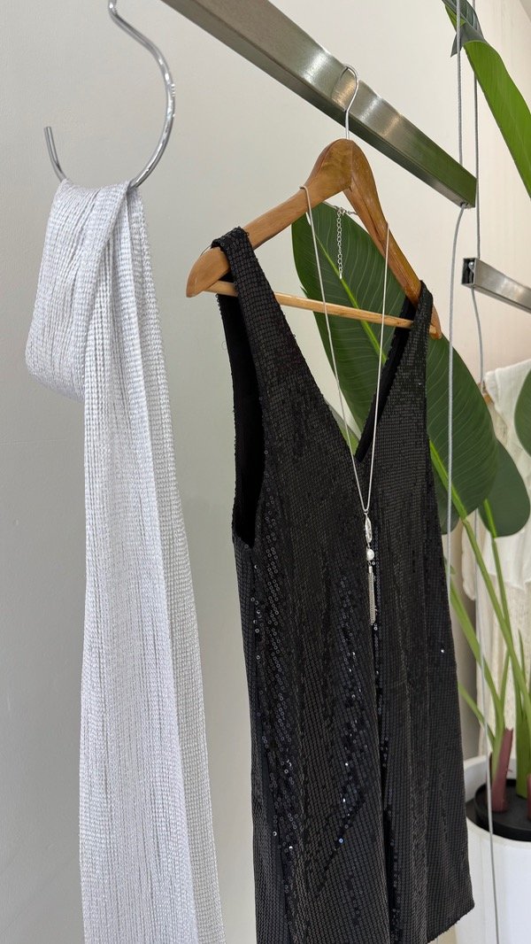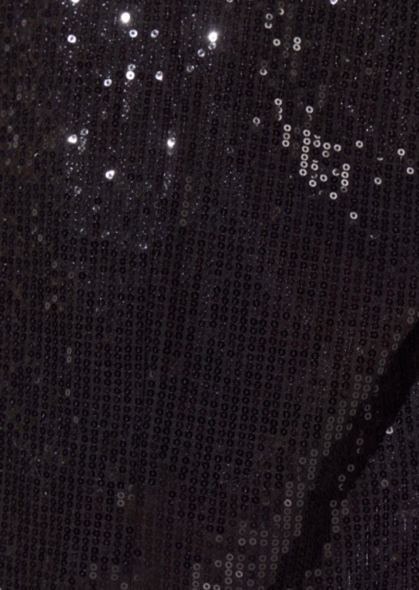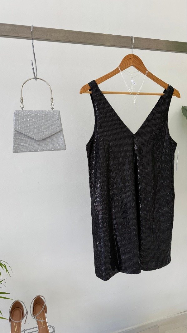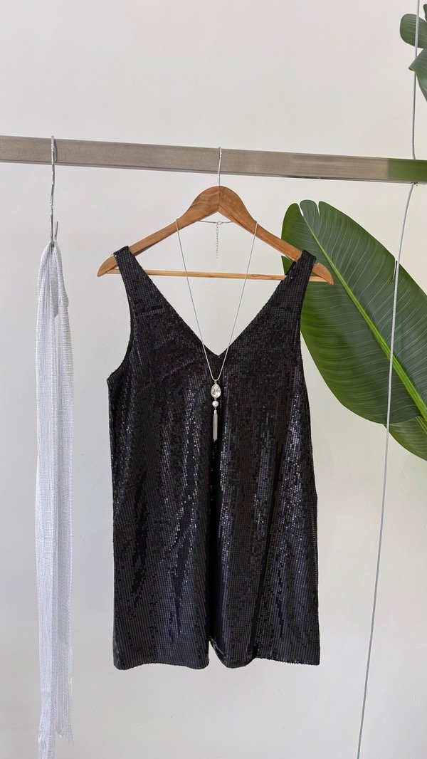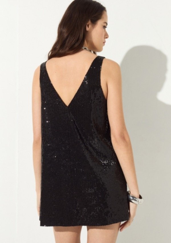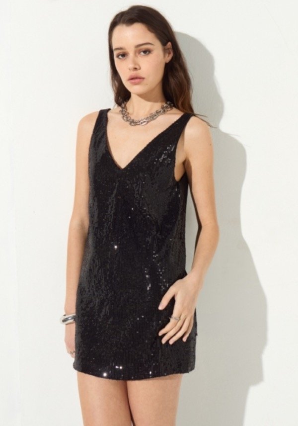 Vestido corto de lentejuelas. Tiene escote V y anchos breteles.