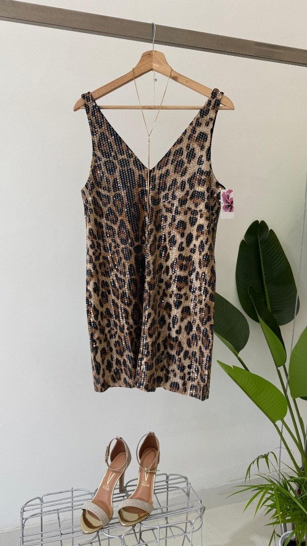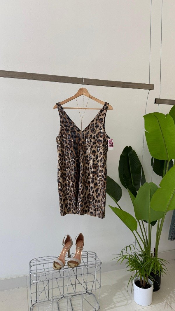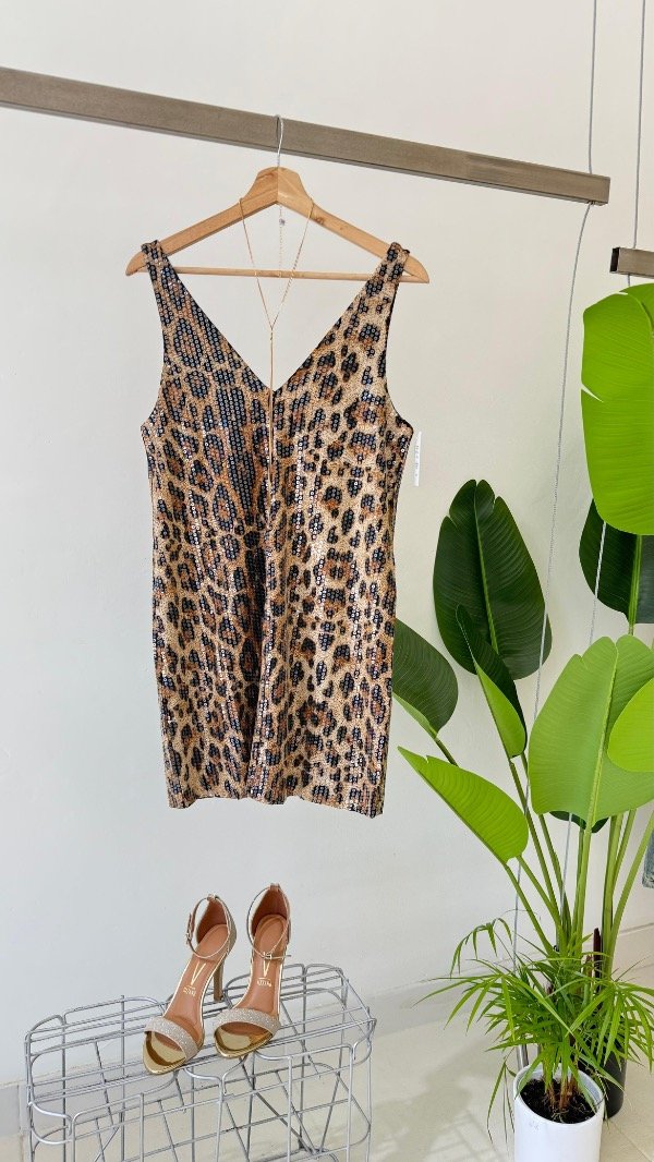 Vestido escote V confeccionado con lentejuelas con estampado animal print exclusivo.